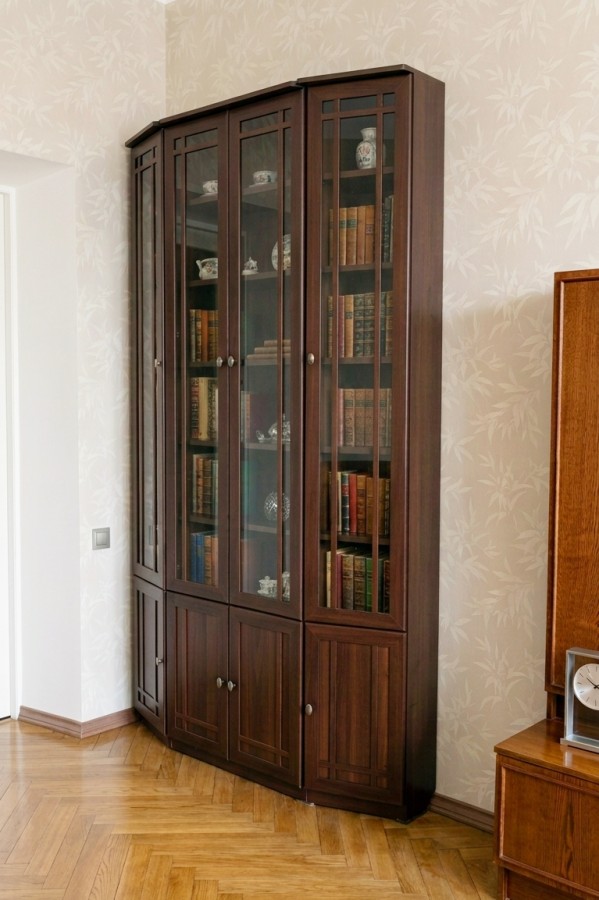 Тонированное стекло защищает книги от вредного воздействия солнечных лучей и убережет их от пожелтения. Книжный шкаф обязательно крепится к стене за подвесы и межсекционной стяжкой с другими шкафами в наборе. Библиотека выпускается без выборки под плинтус, чтобы каждый мог прирезать плинтус индивидуально. В противном случае остаются неаккуратные зазоры между модулем и стеной.