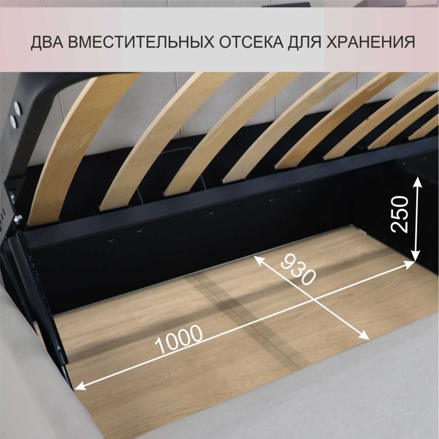 - Внутри кровати два вместительных отсека для хранения вещей.