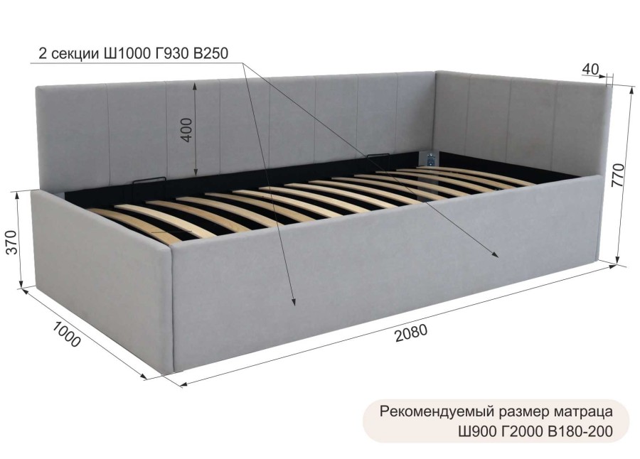 - Рекомендуемый размер матраса: 900х2000 мм, высота 180-200 мм.