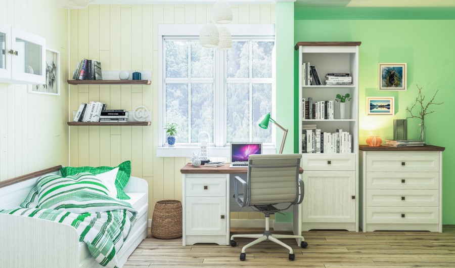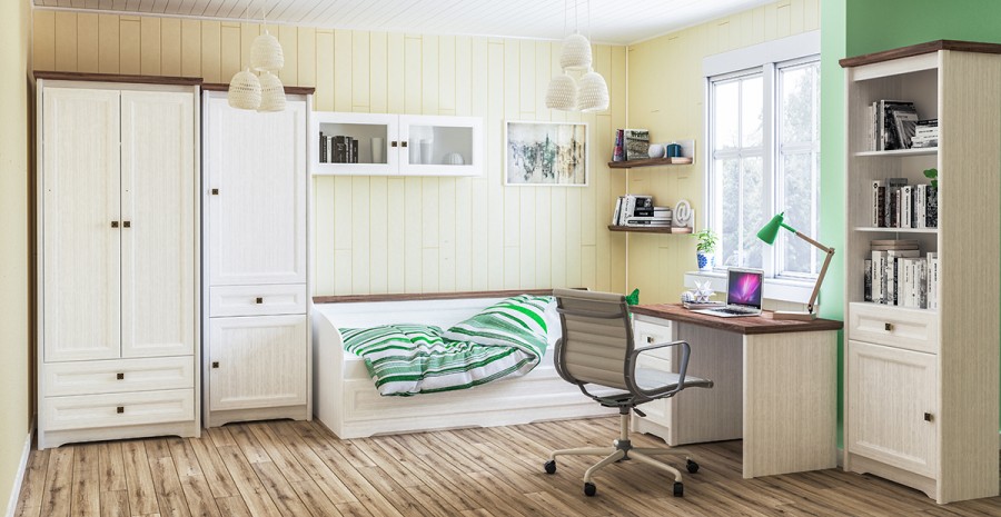 Отличительной чертой стиля «лёгкого кантри» является применение в дизайне не более трёх основных цветов. В качестве основного выступает белый со структурой под дерево, а в противовес ему для создание контраста идёт тёмный цвет с текстурой дуба. Такая универсальная цветовая гамма мебели легко впишется в большинство интерьеров и будет идеальным решением для владельцев любой квартиры или дома.