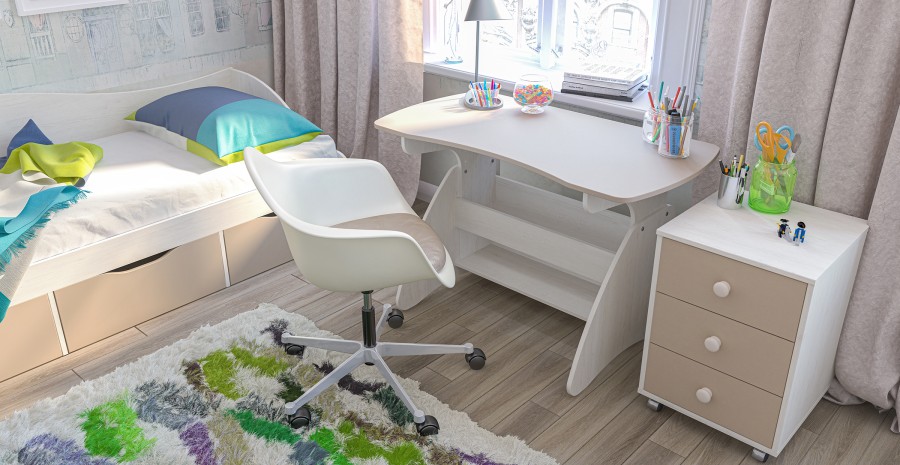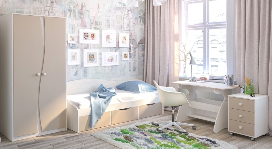 Мебель для молодежной комнаты Комби выполнена в приятных кремово-кофейных тонах, с сочетанием светлой фактуры дерева корпуса и матовых однотонных фасадов цвета «Капучино», что добавит теплоты и уюта в Ваш интерьер.