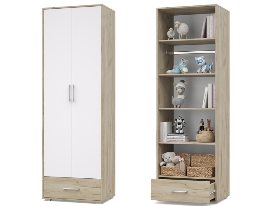 Шкаф двухдверный идеально впишется в детскую или подростковую комнату. Доступен в разных цветах: Ясень Анкор темный/Ясень Анкор светлый, Дуб серый/Белый, что позволяет выбрать подходящий вариант под Ваш интерьер.