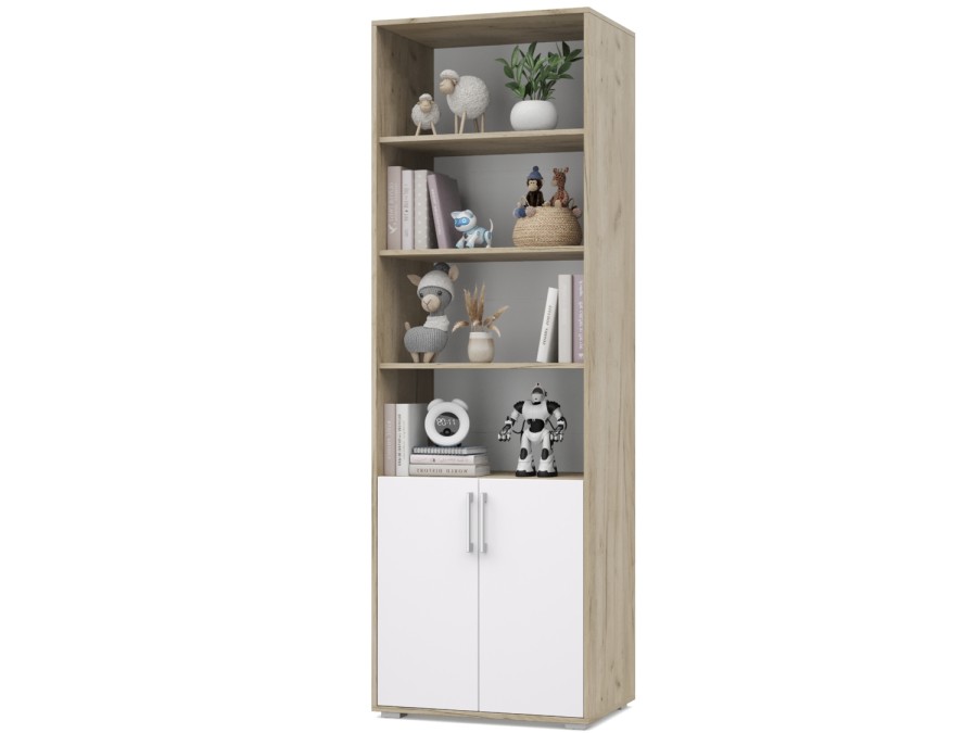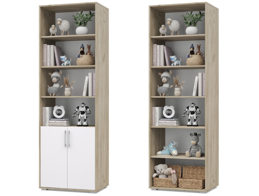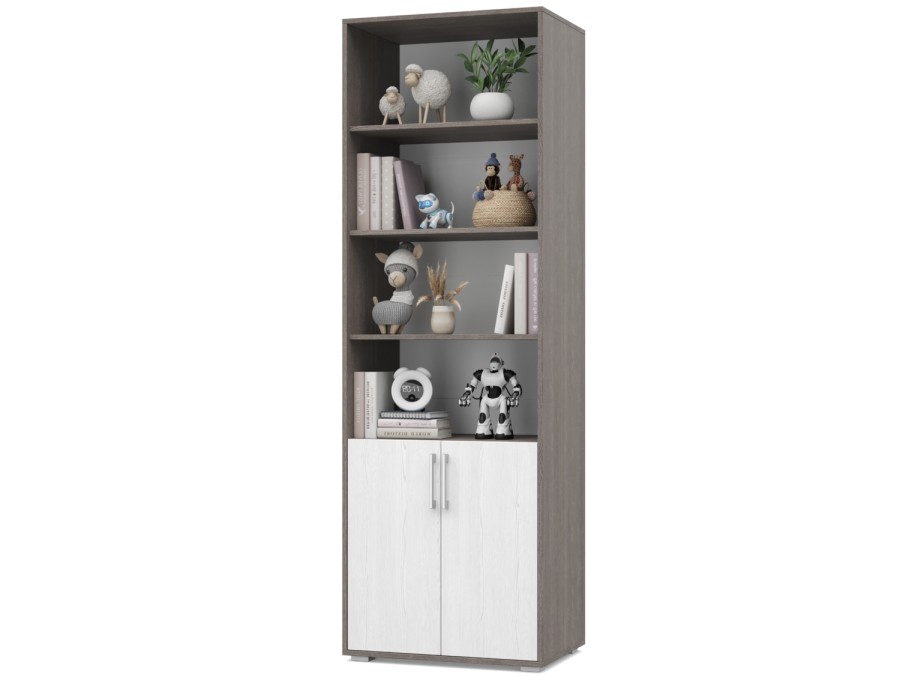 Стеллаж Оливия шириной 66.6см имеет внизу закрытую нишу и петли с доводчиками, в верхней части вместительные полки. Доступен в разных цветах: Ясень Анкор темный/Ясень Анкор светлый, Дуб серый/Белый, что позволяет выбрать подходящий вариант под Ваш интерьер.