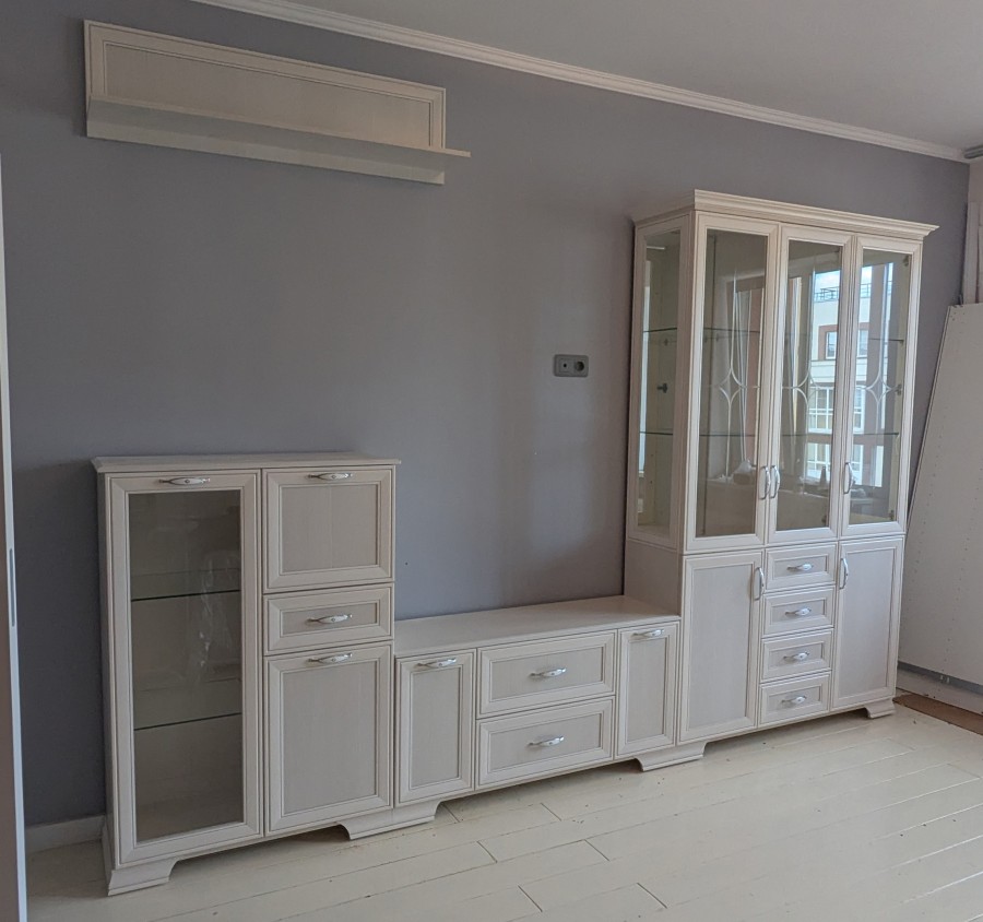 Гостиная «Венеция» выполнена в светлом декоре «Бодега светлая», в лучших классических традициях: фигурными карнизами и цокольными накладками, с изящной фацетной фрезеровкой на остекленных дверцах, с накладным профилем на фасадах.