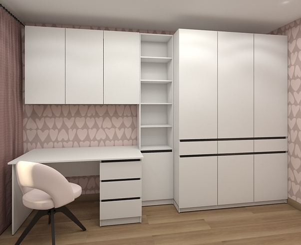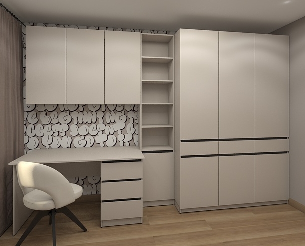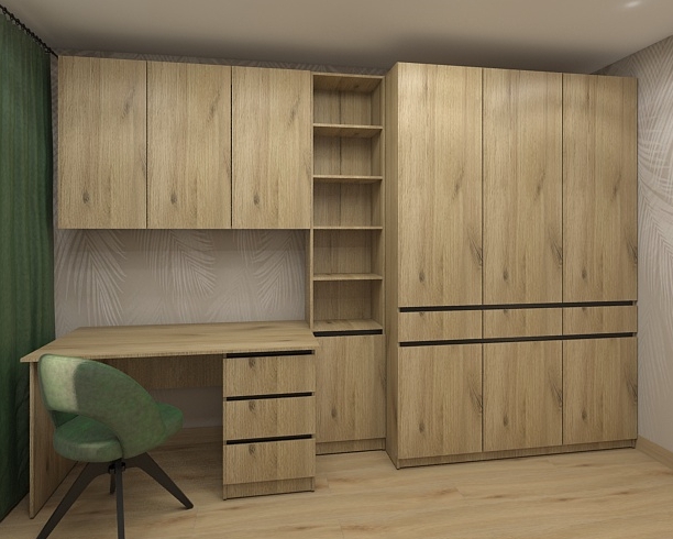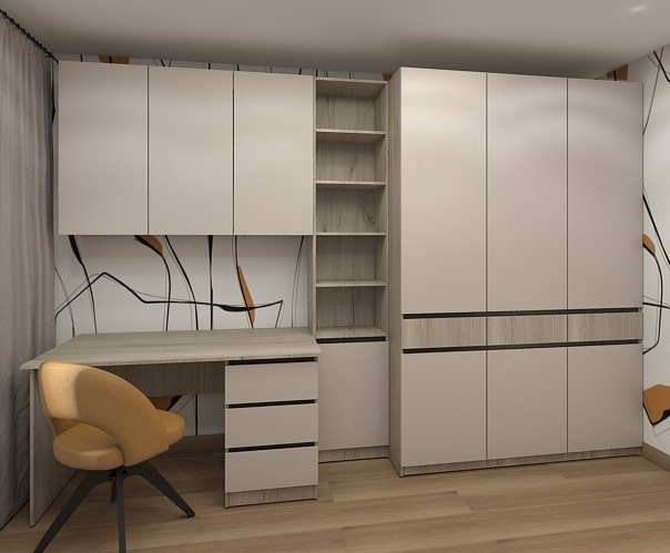 Стеллаж можно дополнить шкафом навесным, столом рабочим, собрав универсальное и функциональное пространство для учебы, работы.