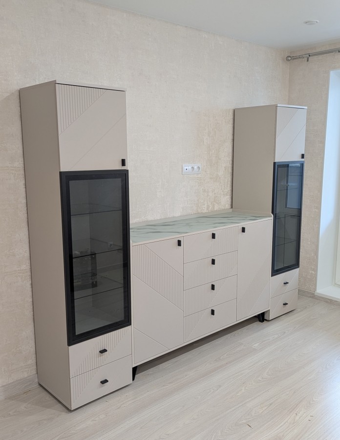Гостиная «Кашемир» компактна, но при этом максимально функциональна, отлично подойдет для узкой или небольшой гостиной.