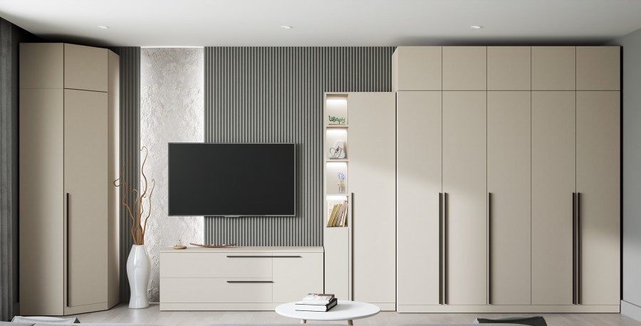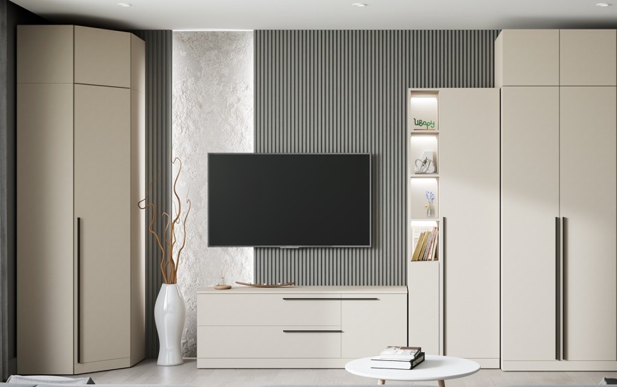 Совершенная новая гостиная в самом трендовом цвете ЛДСП. На выбор представлены два цвета ручек: черный матовый и сатиновое золото. Стеллаж отлично вписывается интерьер и сочетается с одноименной серией.