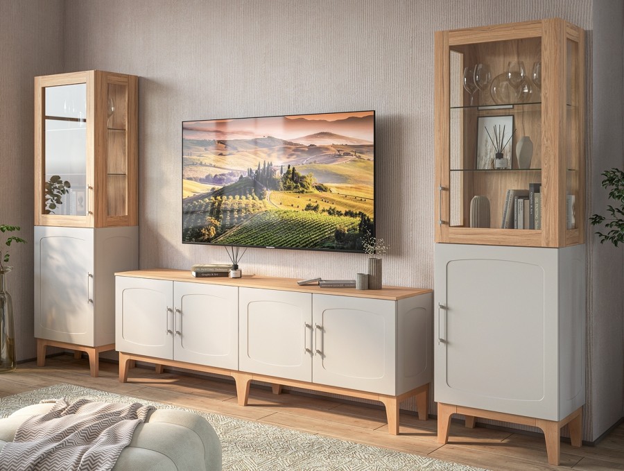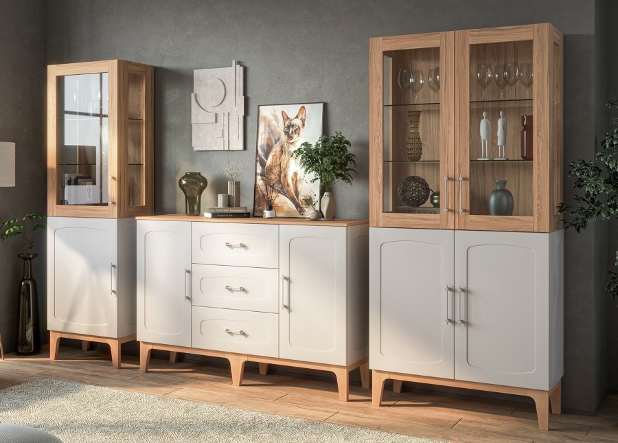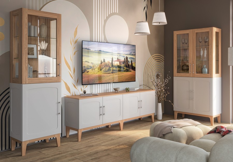 Изящные ножки из массива дерева придают композиции воздушность и визуально расширяют пространство, наполняя его светом. Инновационное матовое покрытие фасадов – это тактильное наслаждение, мягкая бархатистая поверхность, которая словно приглашает прикоснуться. Стеклянные витрины добавляют лёгкость и глубину, создавая эффект простора и ощущение порядка.