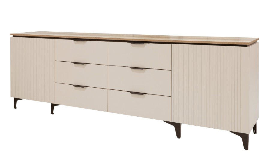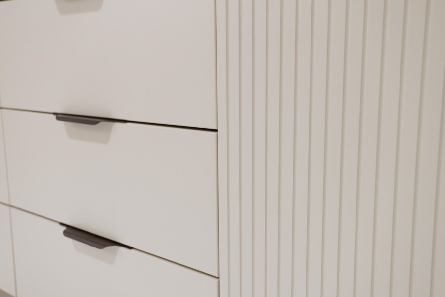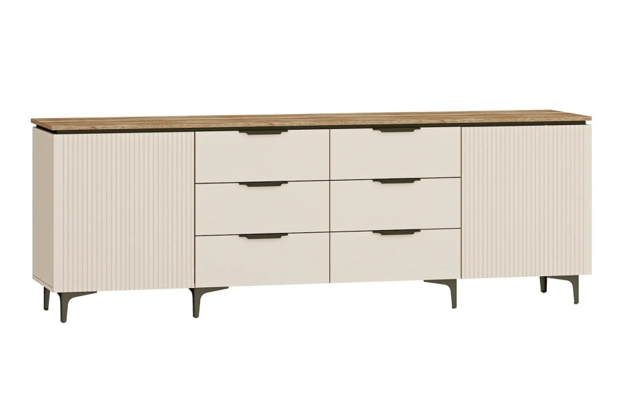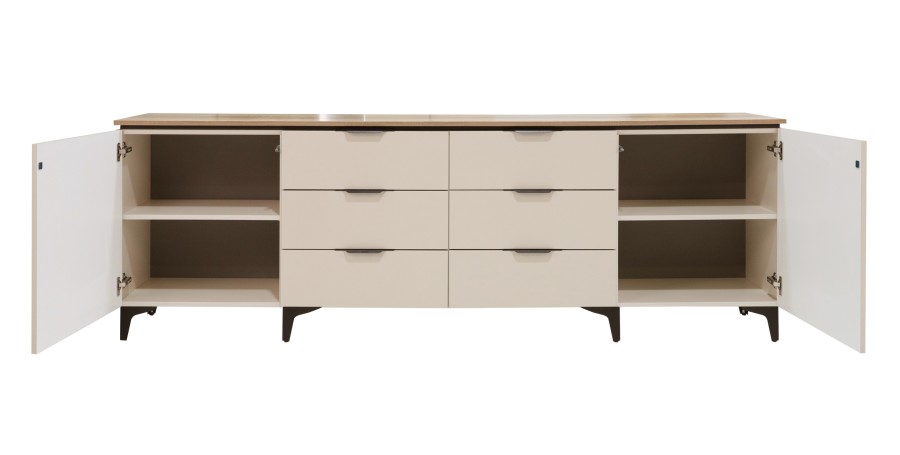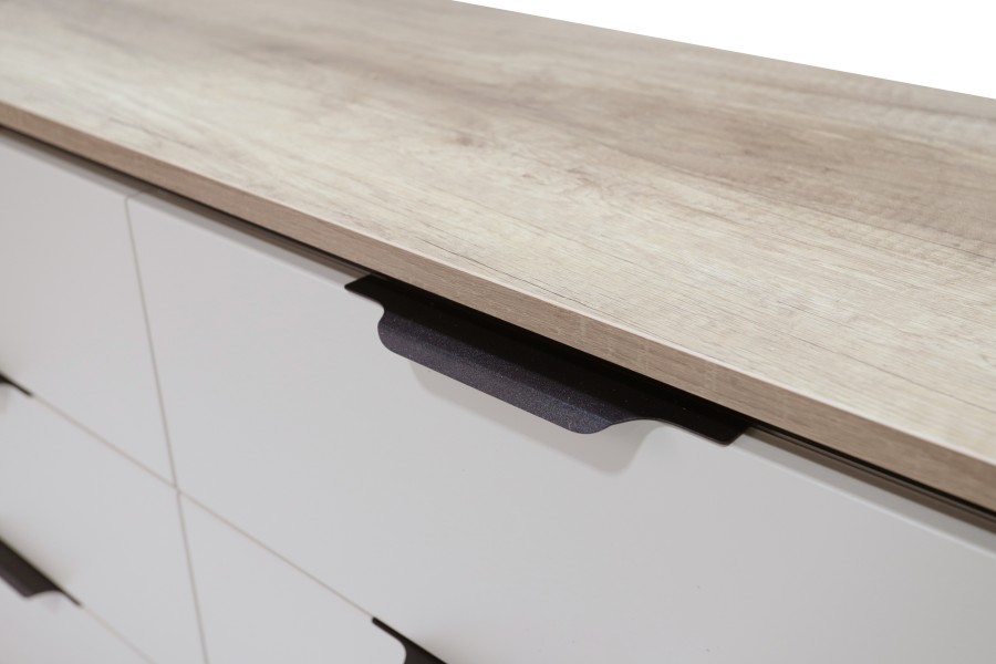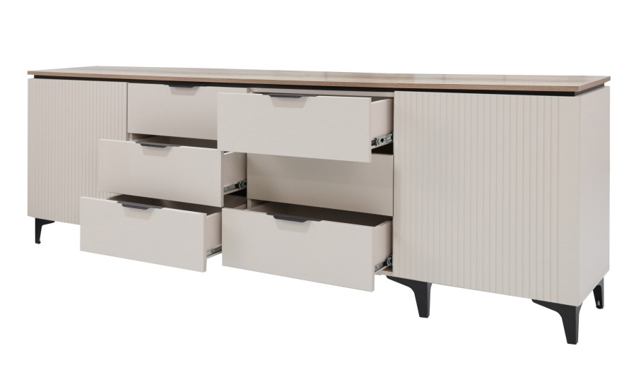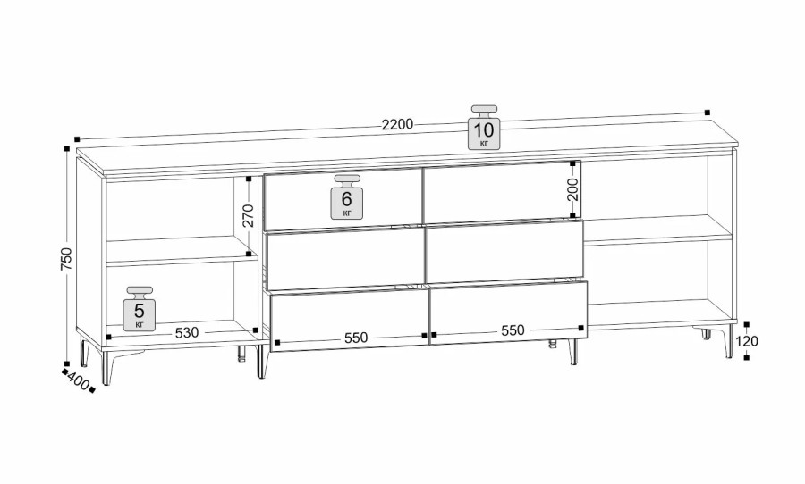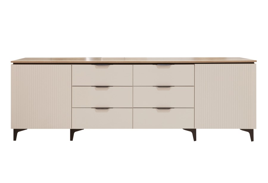Обновленная тумба для ТВ обладает повышенной вместительностью, что делает её идеальным местом для размещения вашей техники и аксессуаров. Черные опоры и ручки добавляют современности и элегантности, хорошо сочетаются с классическим дизайном, придавая вашему интерьеру изысканный вид.