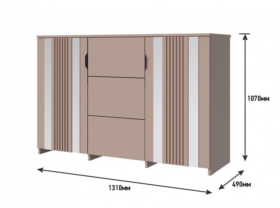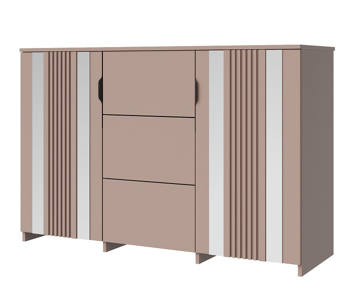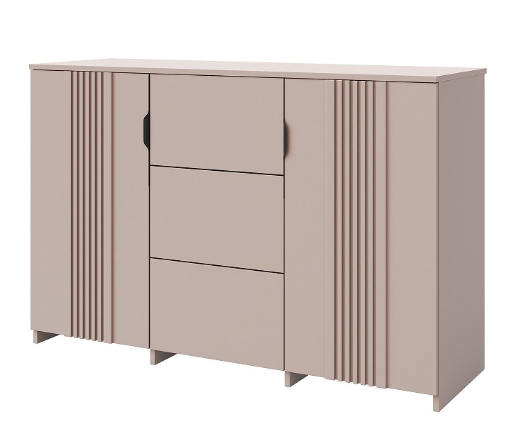 Комод с тремя наружными выдвижными ящиками, установленные на направляющие скрытого монтажа, и двумя распашными дверями.