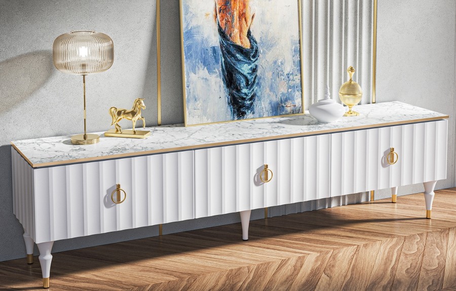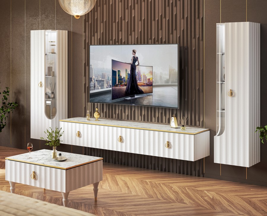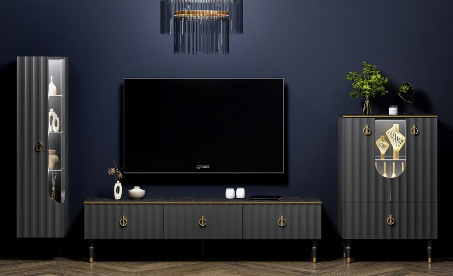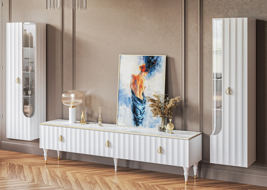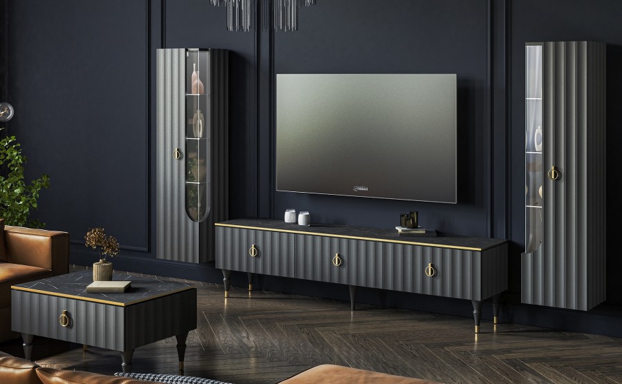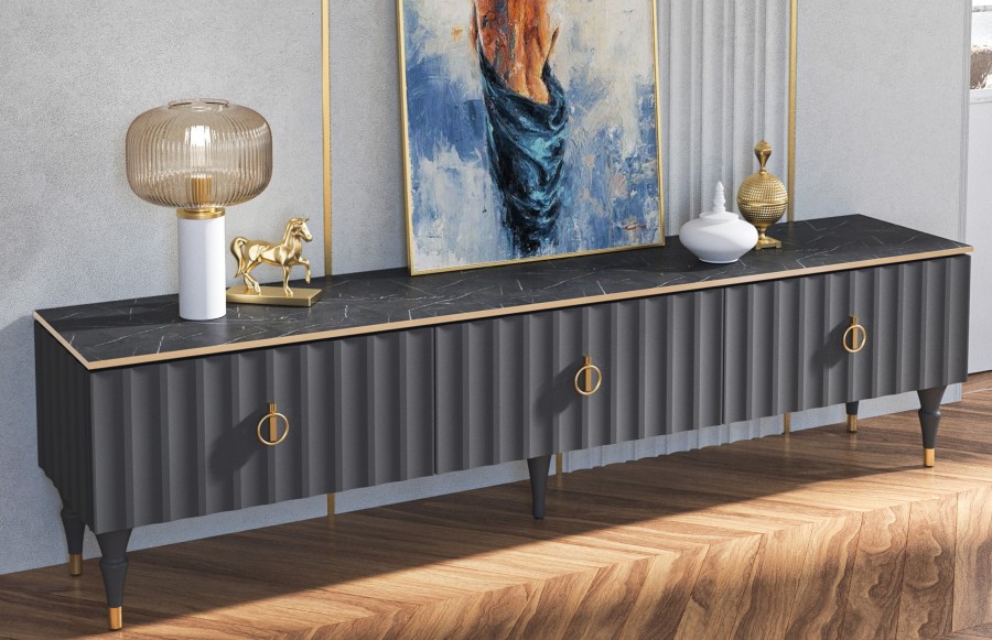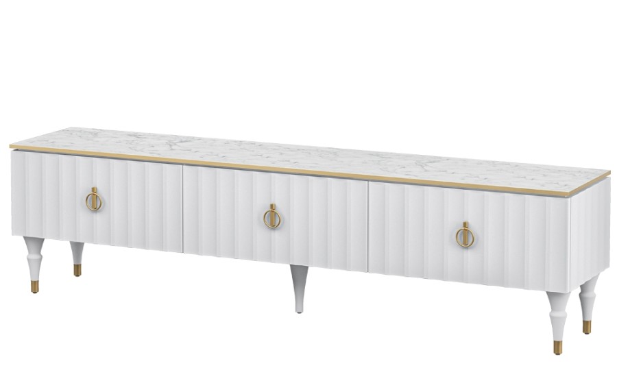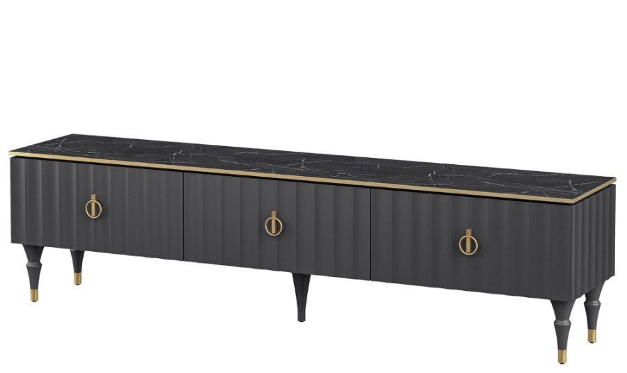 Коллекция мебели Лоренсо – это изысканный дизайн, подчеркнутый золотой металлической линией на изящной столешнице Мрамор Неро Маркина и Мрамор Каррара с фактурой необработанного камня.