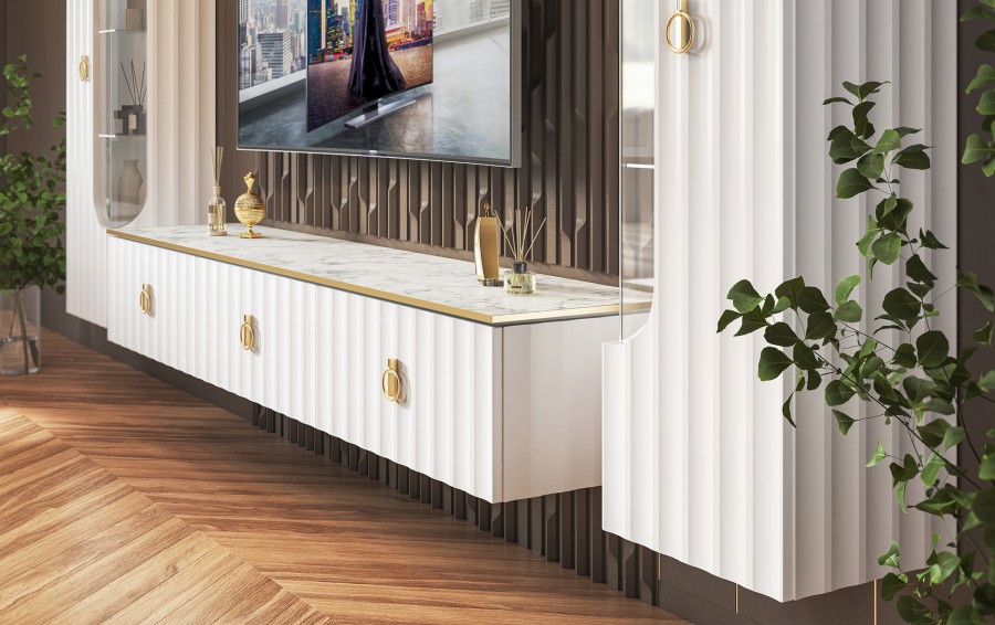 Дизайнерские резные ножки из дерева придают коллекции легкость, а инновационное матовое покрытие от итальянских производителей будто приглашает дотронуться до бархатистой волны фасада и ощутить тепло прикосновения.