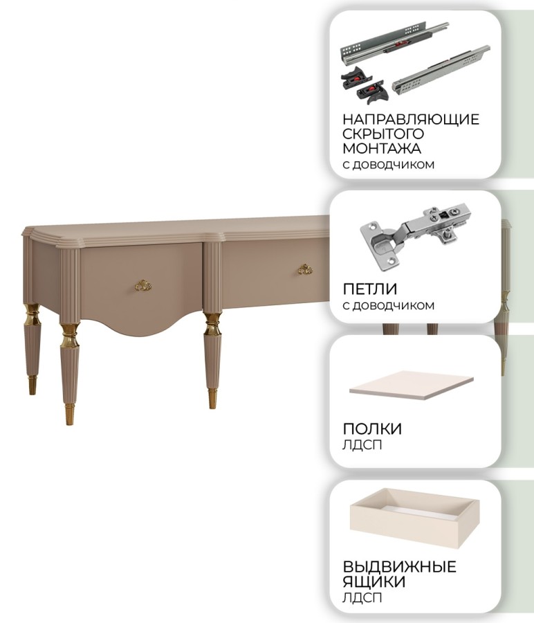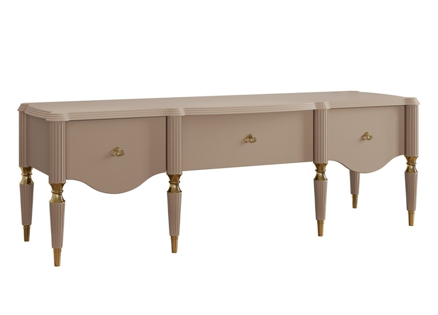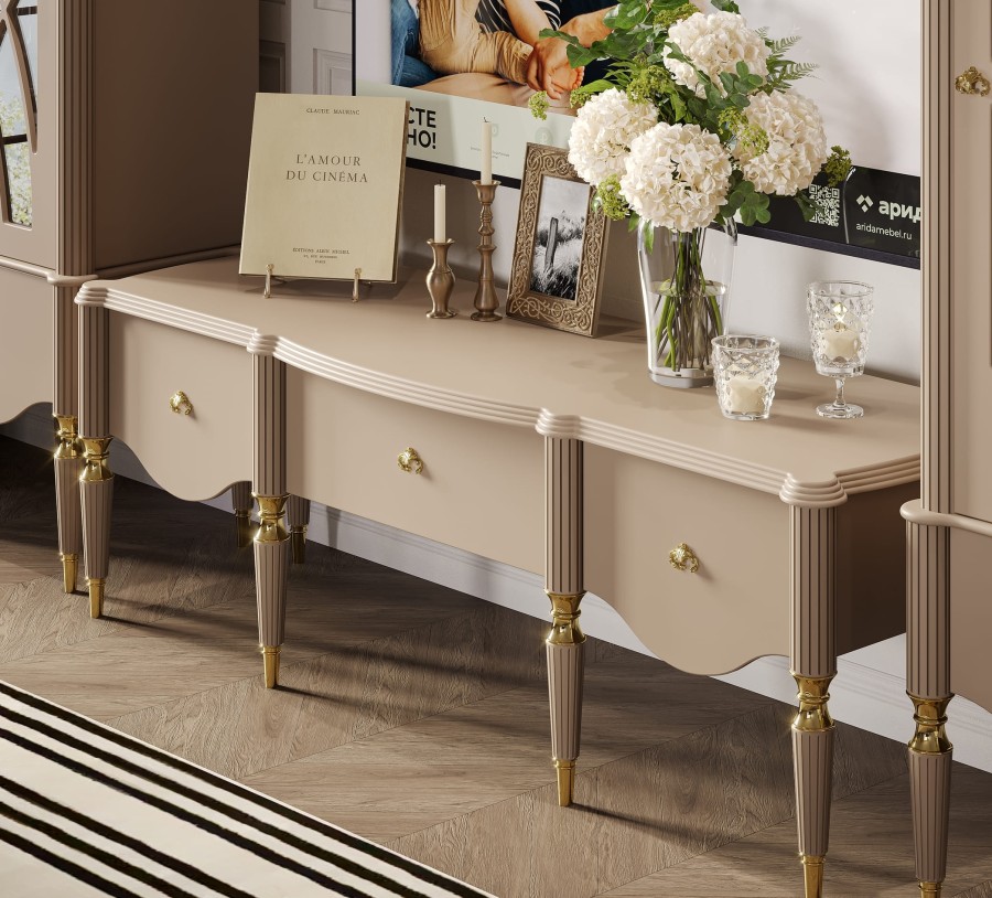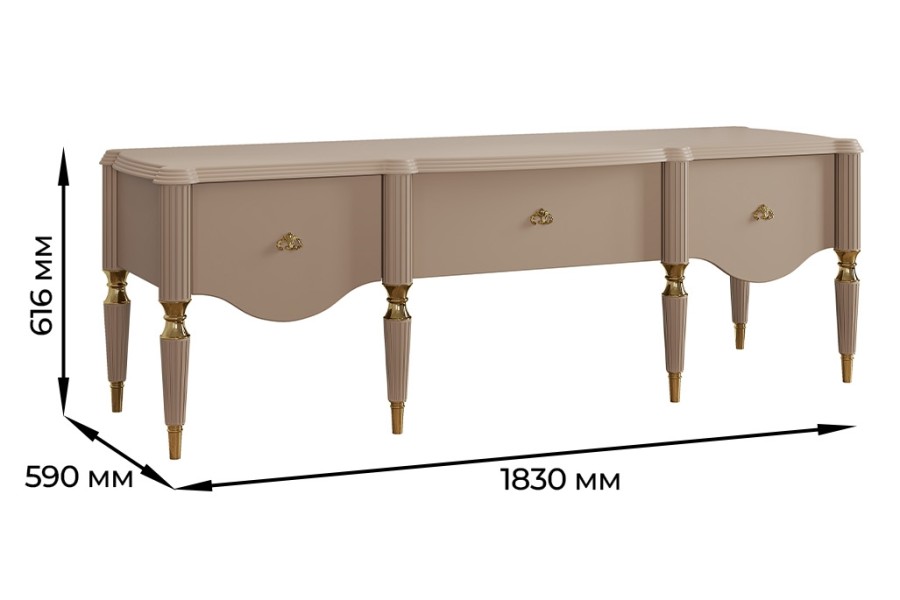 ТВ-тумба София идеально подходит для размещения телевизора и других мультимедийных устройств. Она обладает утончённым дизайном в стиле неоклассика и удобными отделениями для хранения дисков, пультов дистанционного управления и других аксессуаров.