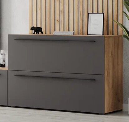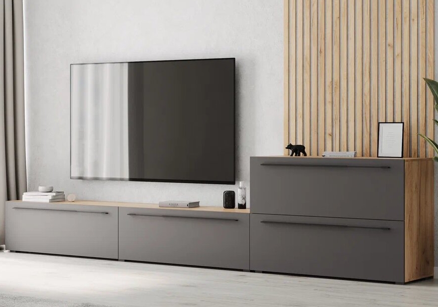 Стоун С82 Модериум — это тумба под телевизор (тв-тумба), для хранения вещей, выполненная в современном стиле с сочетанием древесных и однотонных цветов: Дуб золотой/Графит, Анкор темный/Анкор светлый, Кашемир, Серый дуб/Белый), имеющий размеры (ШхВхГ) 100х230х52 см.