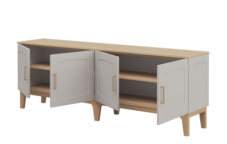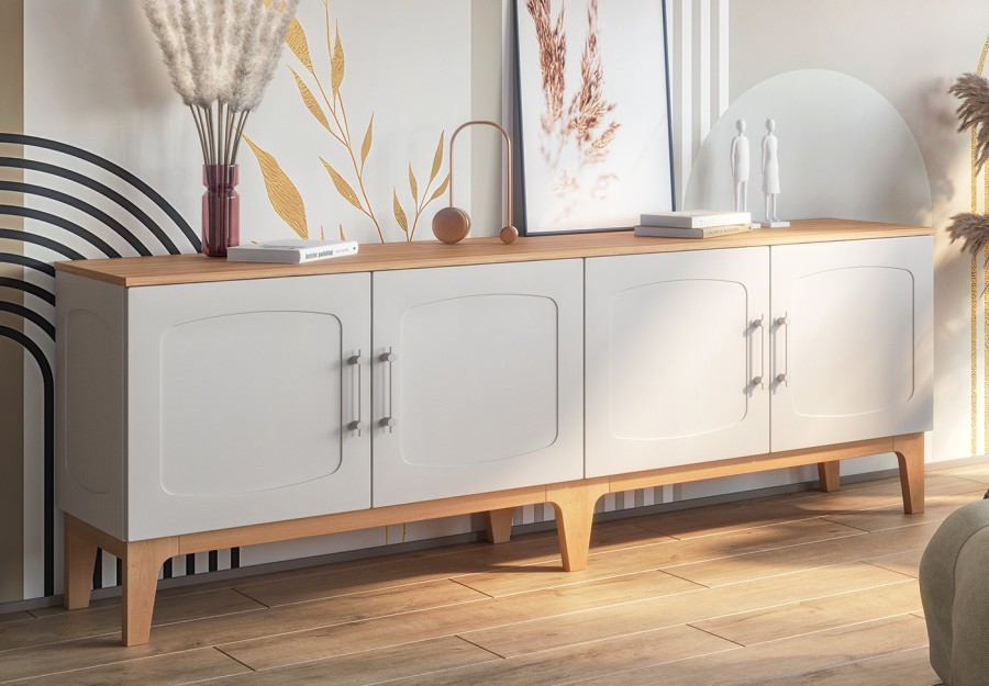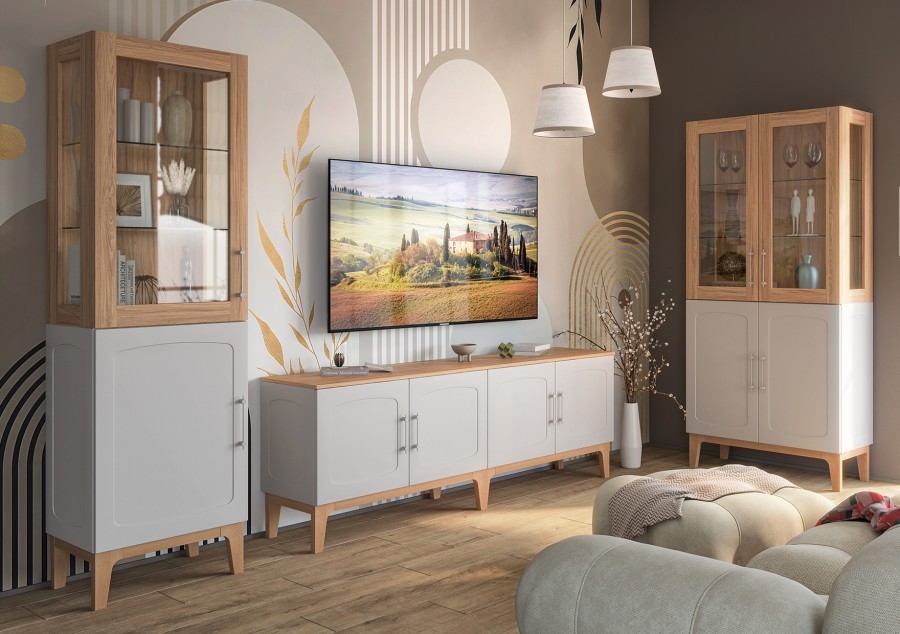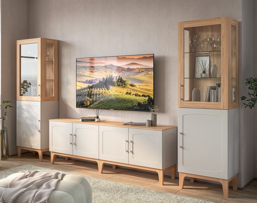 Изящные ножки из массива дерева придают композиции воздушность и визуально расширяют пространство, наполняя его светом. Инновационное матовое покрытие фасадов – это тактильное наслаждение, мягкая бархатистая поверхность, которая словно приглашает прикоснуться. Стеклянные витрины добавляют лёгкость и глубину, создавая эффект простора и ощущение порядка.