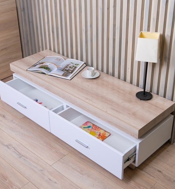 Тумба включает включает в себя два выдвижных ящика для хранения личных вещей.