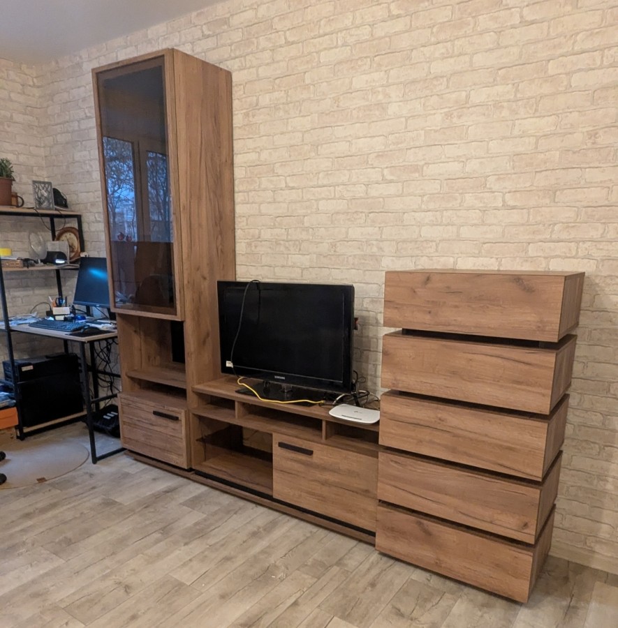 Чтобы сохранить легкость и простор в маленькой гостиной выбирайте Тумба ТВ малая. Низкая мебель сделает комнату просторнее, а стекло в сочетании с древесным декором создаст ощущение простоты. Комбинированный вариант открытых полок со шкафчиком с глухим фасадом отлично подойдет для размещения игровой приставки, дисков и геймпадов. Ширина тумбы позволит без труда разместить телевизор с диагональю до 44''. Регулируемые опоры позволят компенсировать незначительные неровности пола.