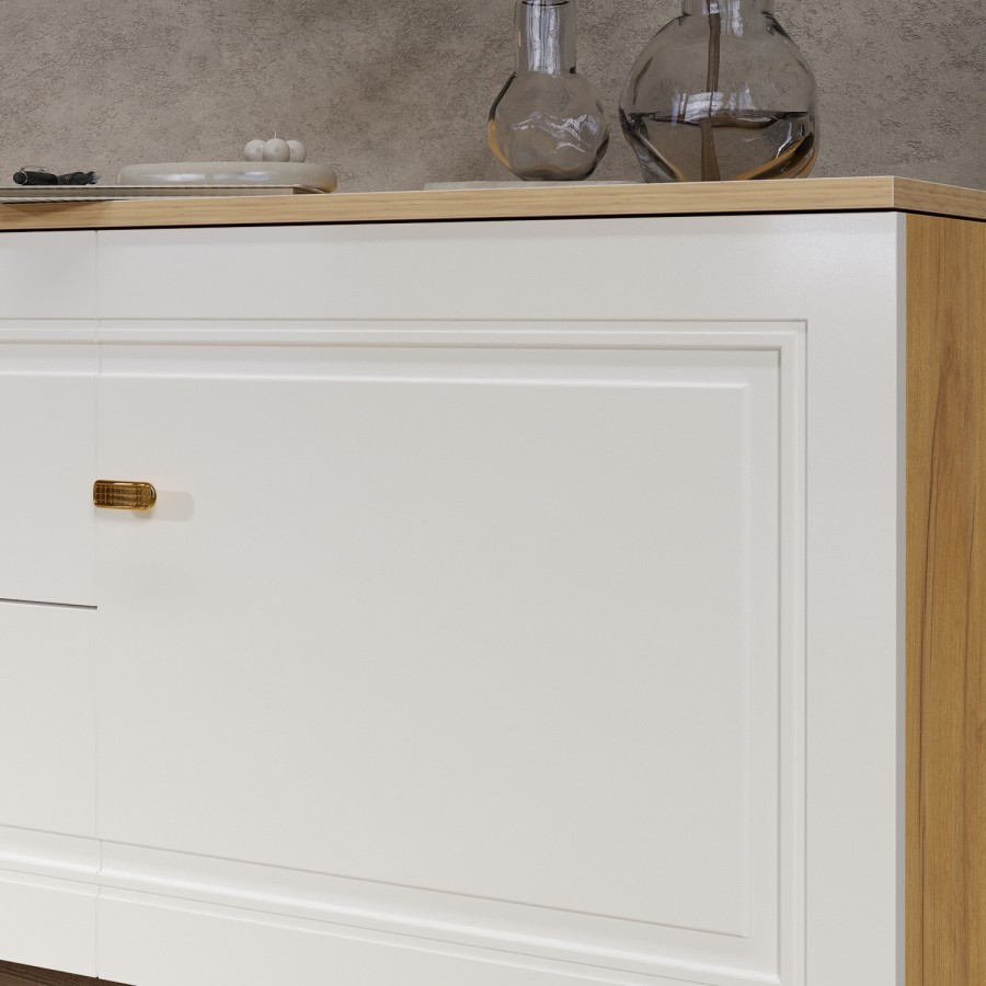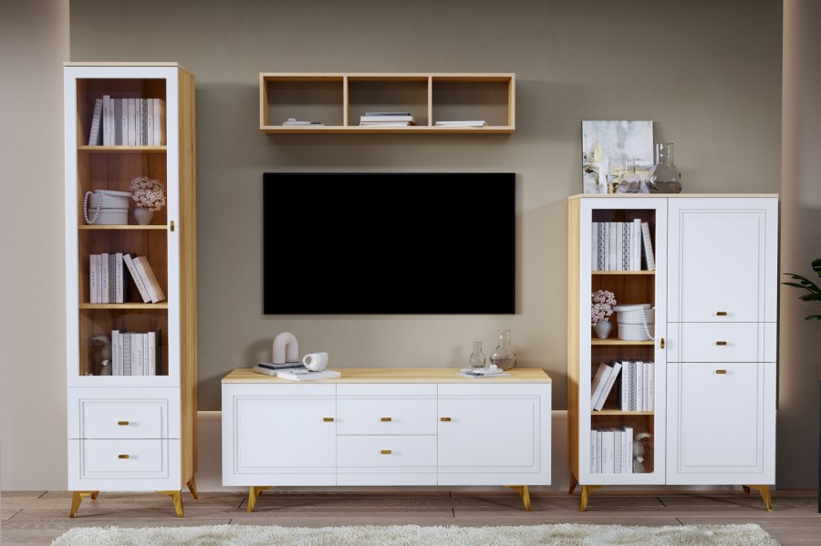 В модульной линейке применяются – МДФ с поверхностью soft touch или глянец. В коллекцию входят различные виды комодов, шкафов и витрин.
