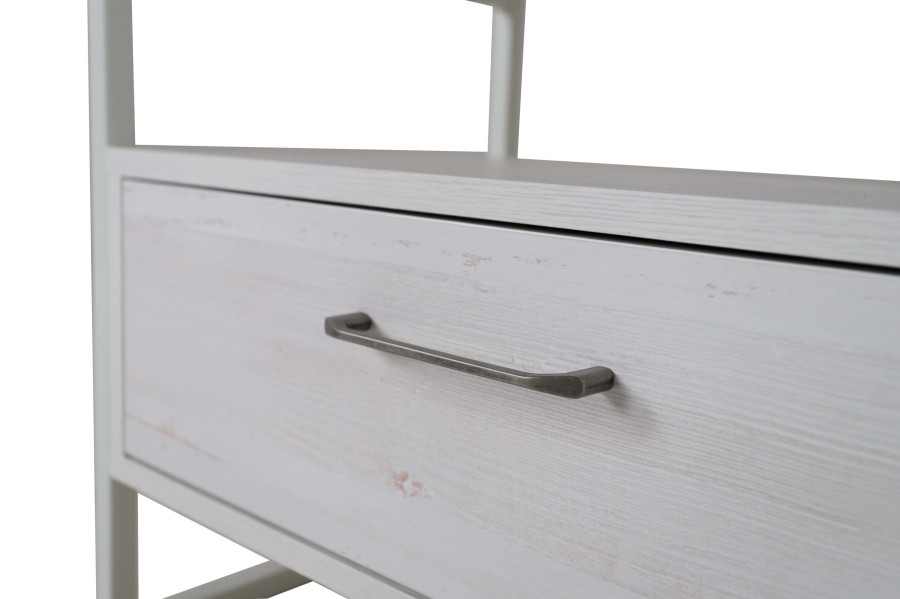 Тумба состоит из 2-х выкатных ящиков, вместительных пололок для ваших вещей и предметов декора.