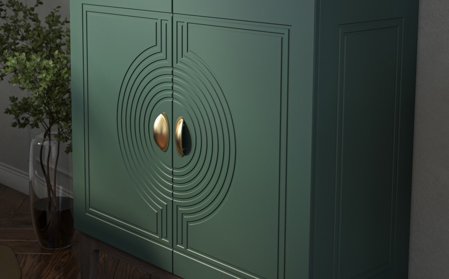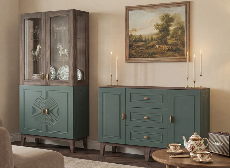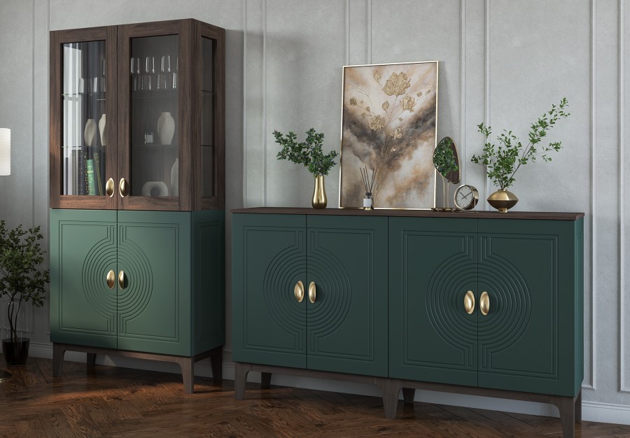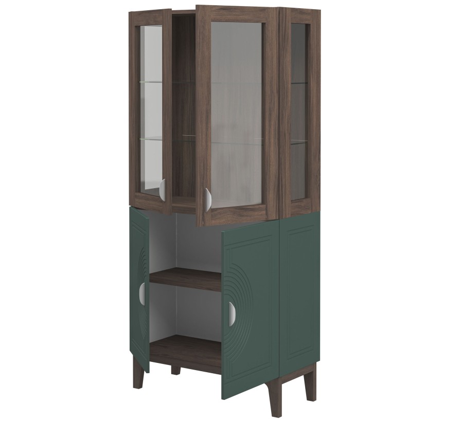 Сочетание насыщенного корпуса Гикори Прадо и акцентного фасада Комбу Грин формирует образ, в котором выразительность встречается с утончённостью. Тёплая древесная текстура наполняет интерьер уютом, а глубокий зелёный фасад придаёт пространству характер и индивидуальность.