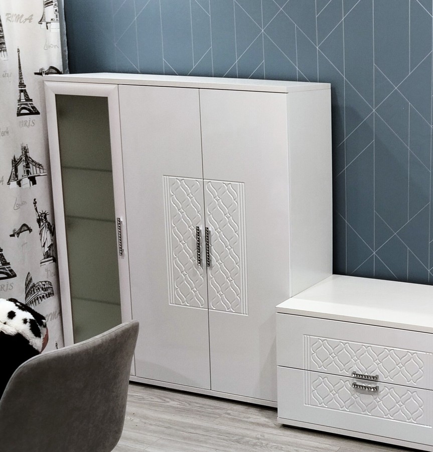 - Фасады МДФ с фрезеровкой «Орхидея» украшены ручками с кристаллами.