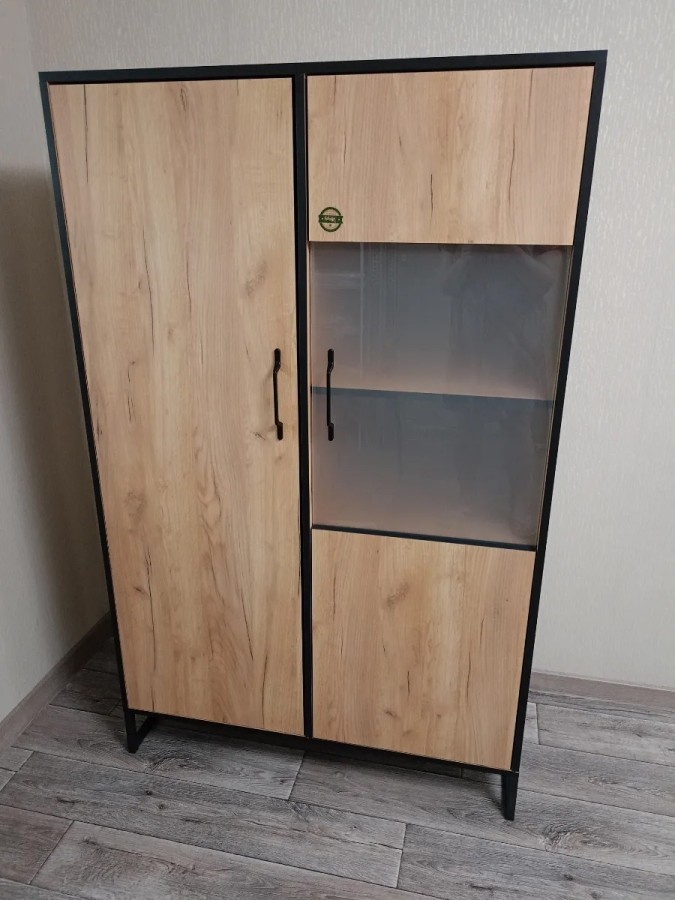 Шкаф имеет универсальную сборку и вставку из белого матового стекла. Внутри него находится десять больших полок.