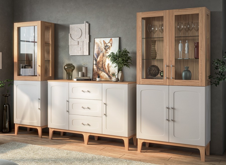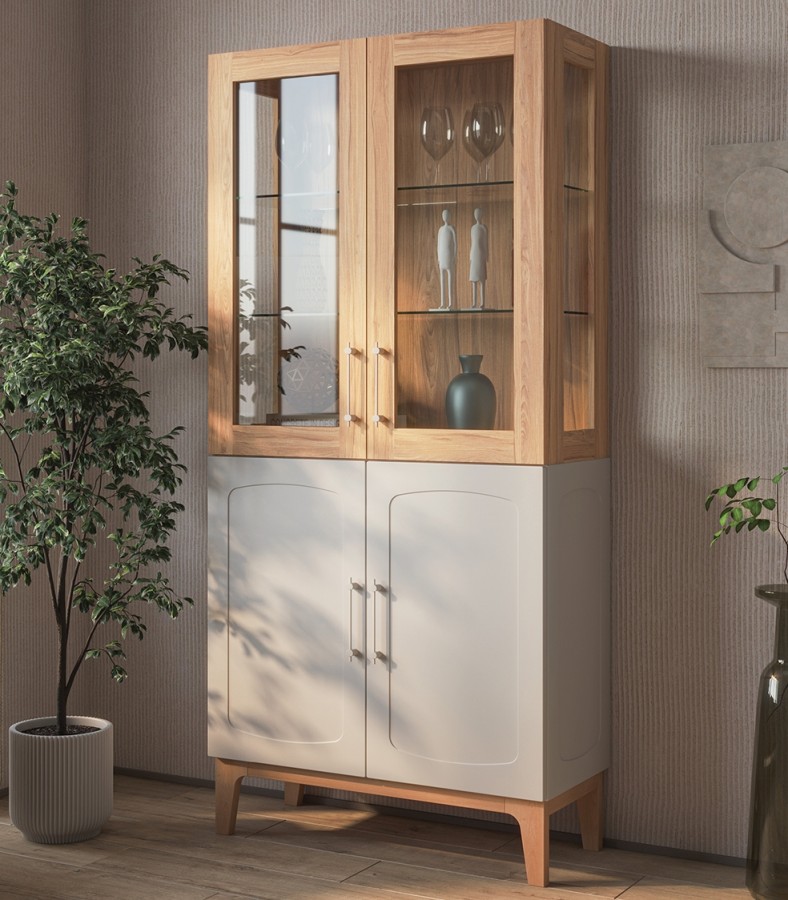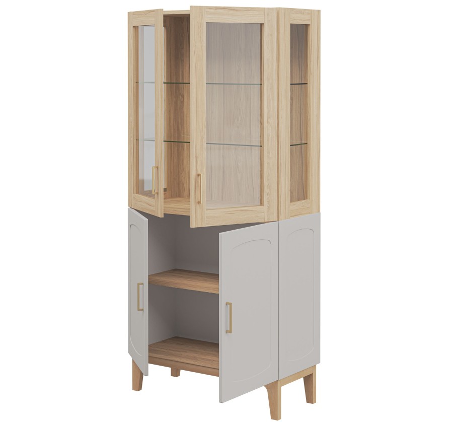 Изящные ножки из массива дерева придают композиции воздушность и визуально расширяют пространство, наполняя его светом. Инновационное матовое покрытие фасадов – это тактильное наслаждение, мягкая бархатистая поверхность, которая словно приглашает прикоснуться. Стеклянные витрины добавляют лёгкость и глубину, создавая эффект простора и ощущение порядка.