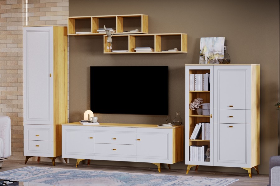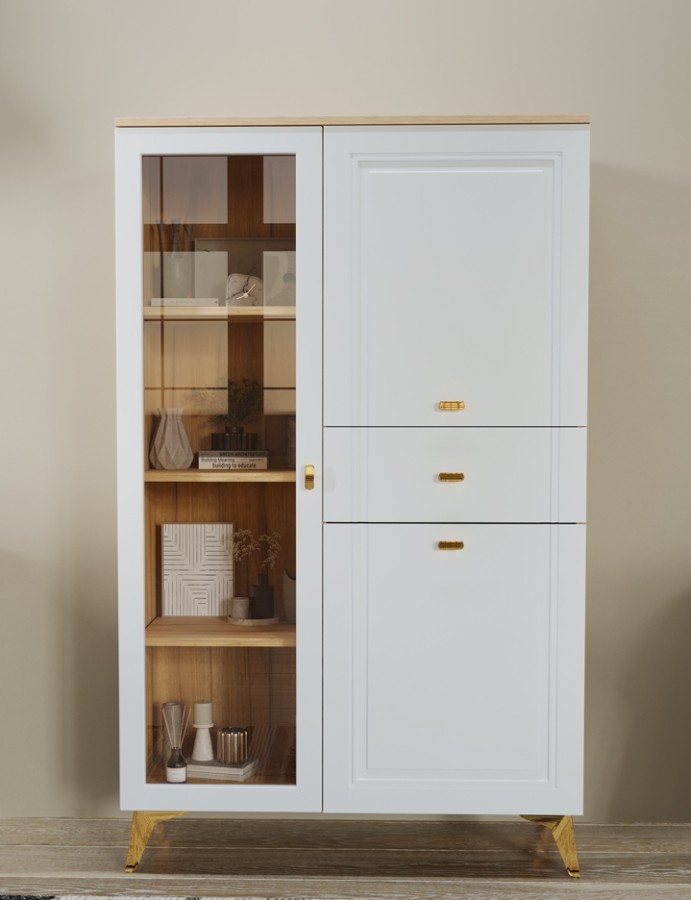 В модульной линейке применяются – МДФ с поверхностью soft touch или глянец. В коллекцию входят различные виды комодов, шкафов и витрин.