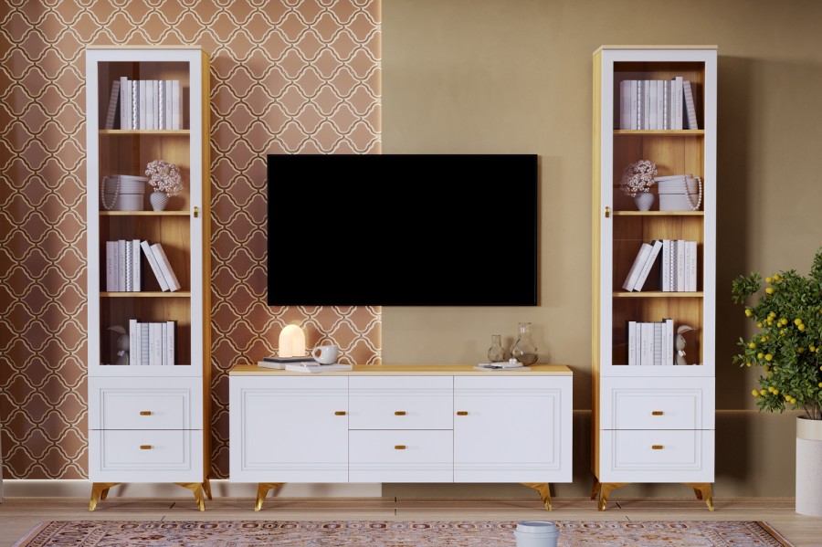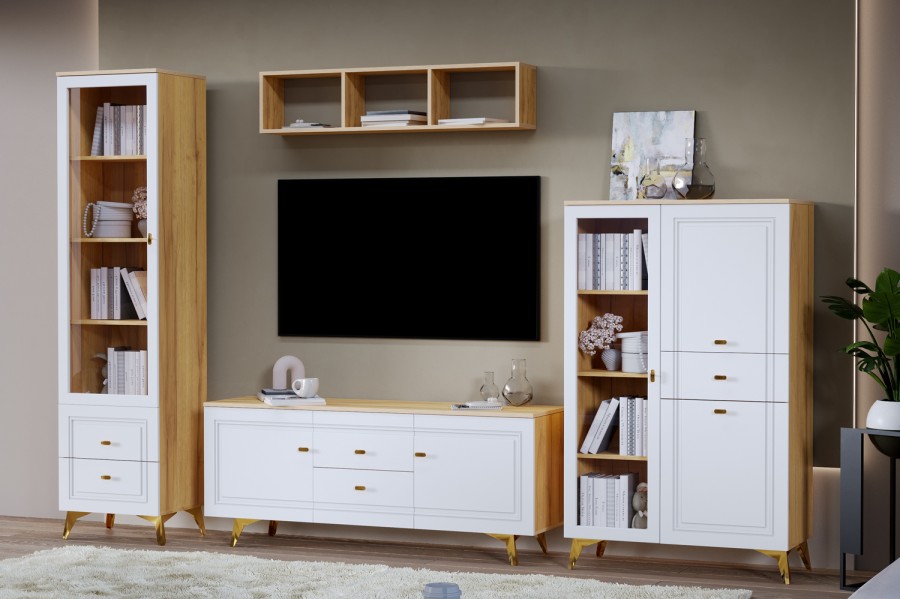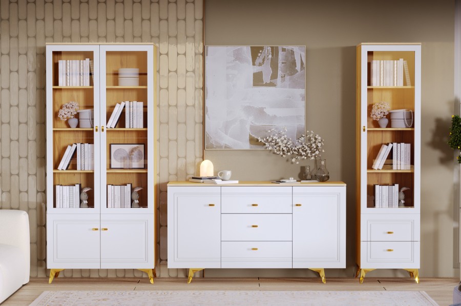 В модульной линейке применяются – МДФ с поверхностью soft touch или глянец. В коллекцию входят различные виды комодов, шкафов и витрин.