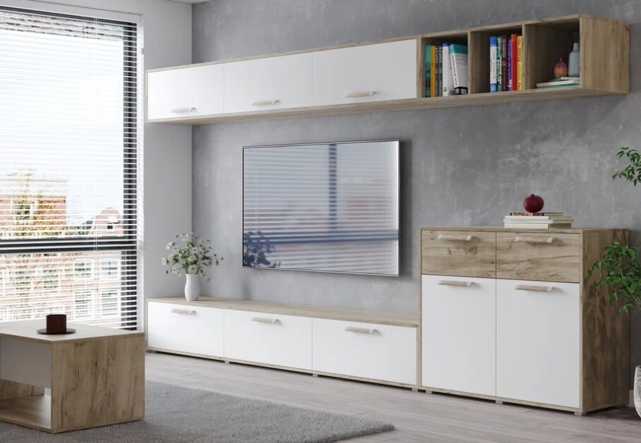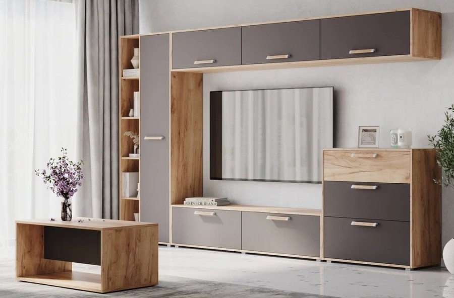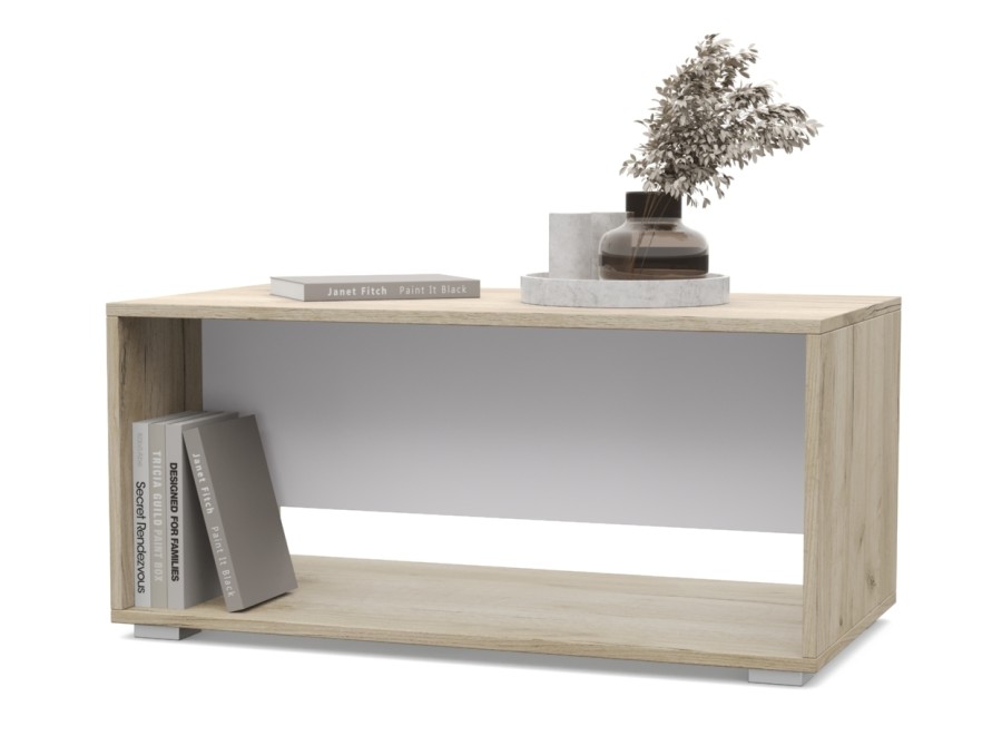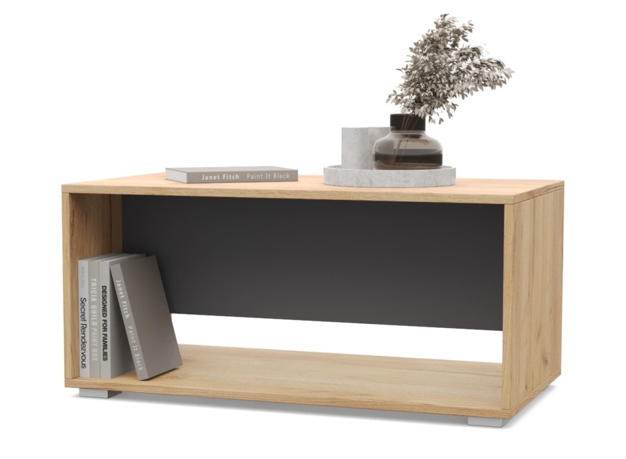 Размеры столешницы составляют 850х450 мм, высота всего столика – 400 мм. Выпцскается в двух цветах Дуб золотой/Графит и Дуб серый/Белый.