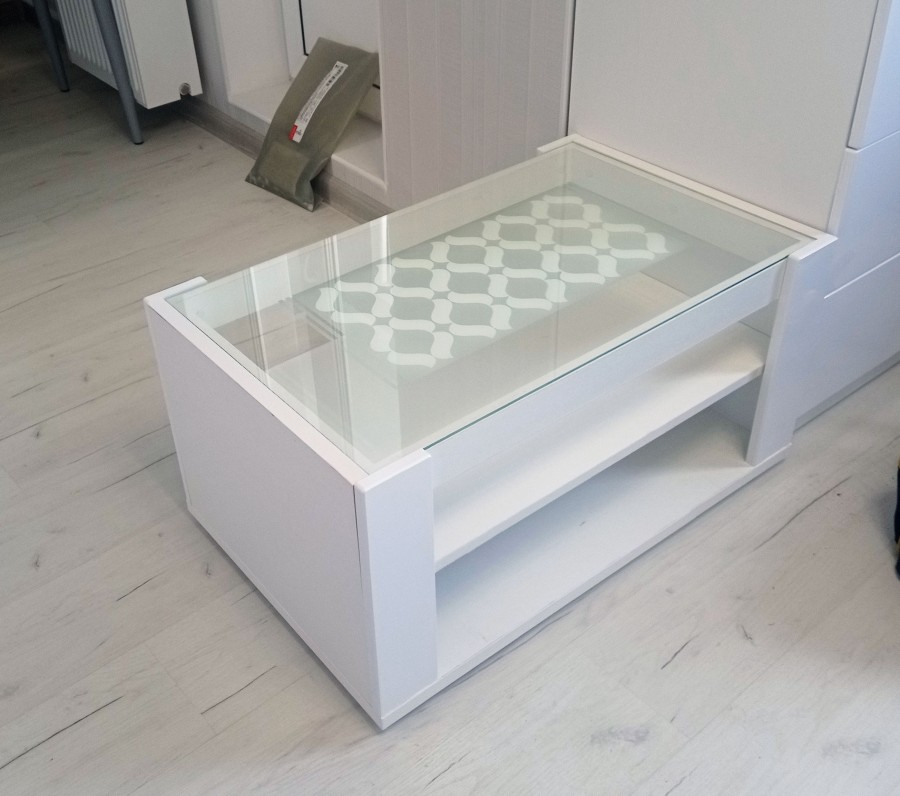 Стол выполнен из качественного ЛДСП. Стеклянная столешница декорирована пескоструйным рисунком.