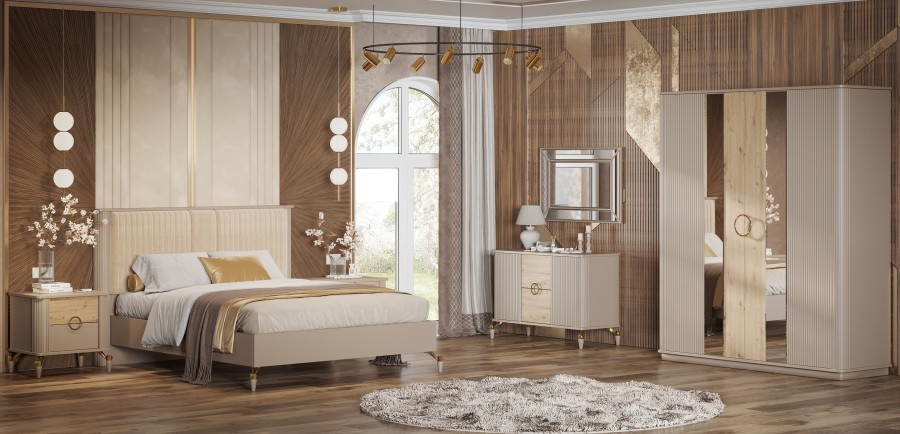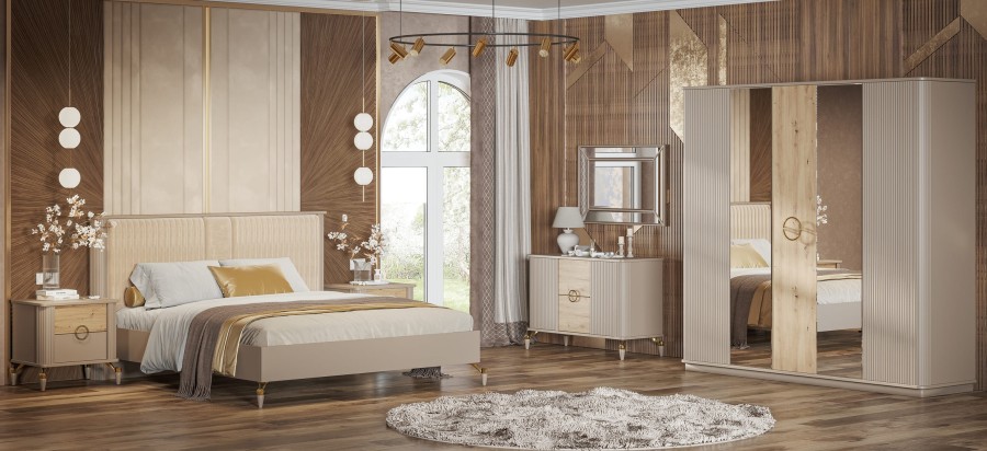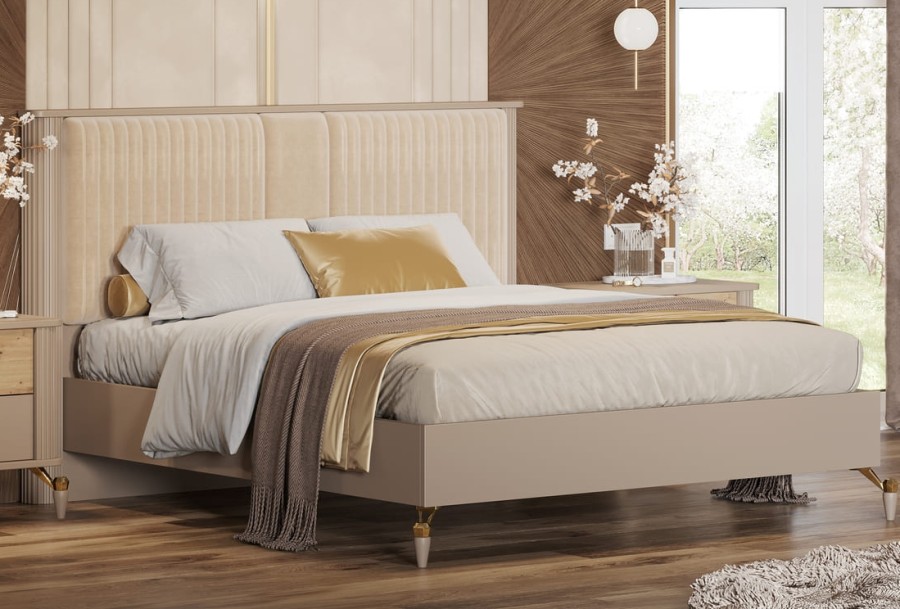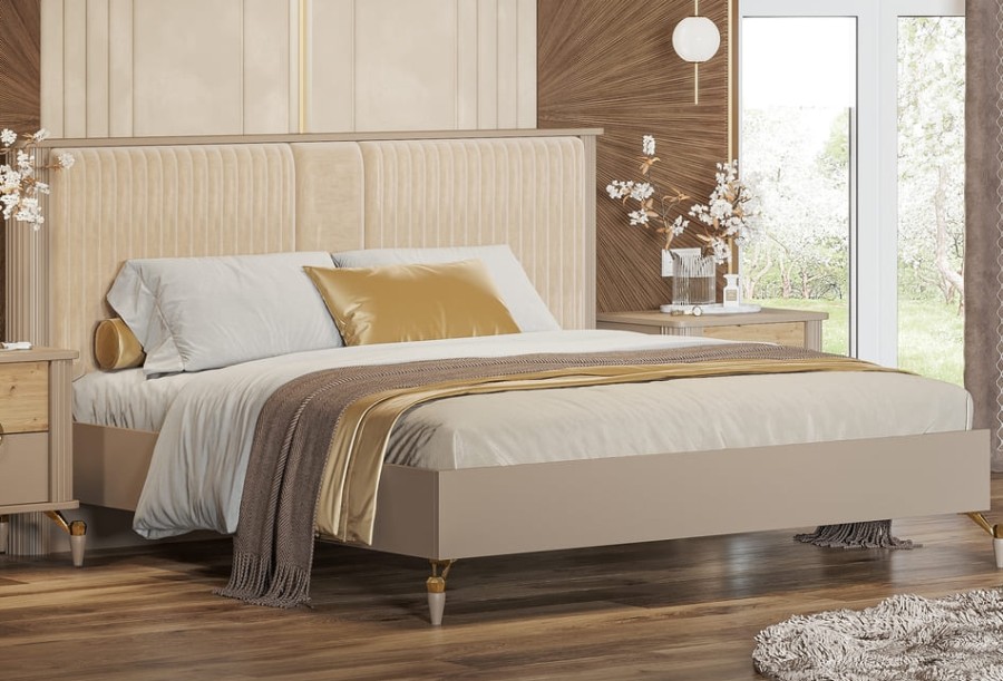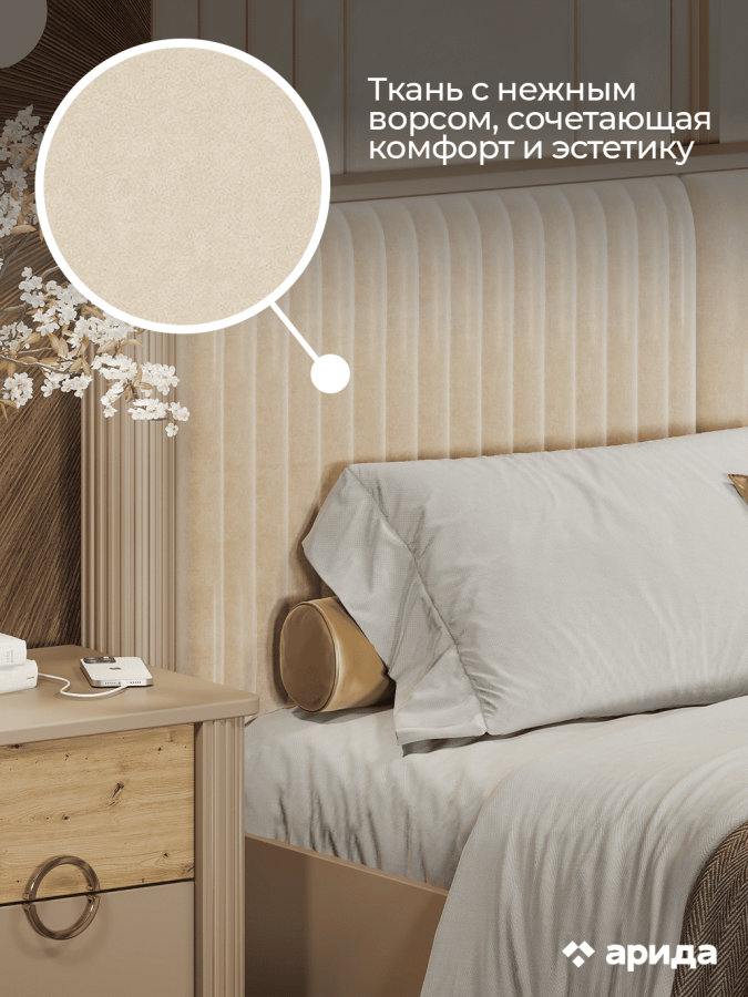 Строгая геометрия коллекции "Мадрид" смотрится благородно и лаконично, а вертикальные линии визуально увеличивают пространство. Такие же вертикальные линии поддерживаются и на изголовье кровати из мягкого велюра.