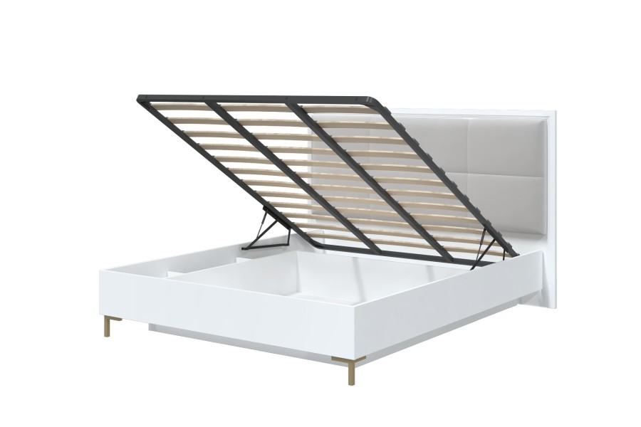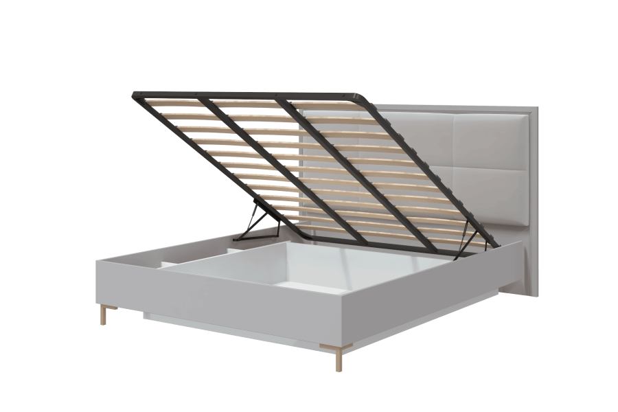 - Кровать с мягкой спинкой, подъемным механизмом и бельевым ящиком.