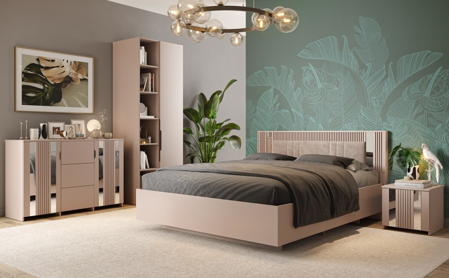 - Изголовье из ЛДСП с мягким элементом, вставками МДФ и зеркал.