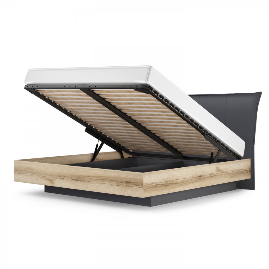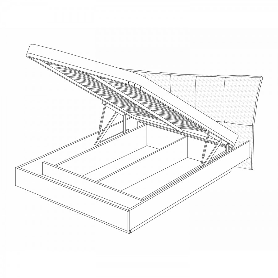 - кровать оснащена подъёмным основанием и вместительным бельевым ящиком, в котором можно разместить большое количество вещей или постельные принадлежности. Подъем основания обеспечивает надежный газлифт. Конструкция кровати устроена таким образом, что бельевой ящик углублен в пространство под кроватью, что создает эффект парения кровати;
