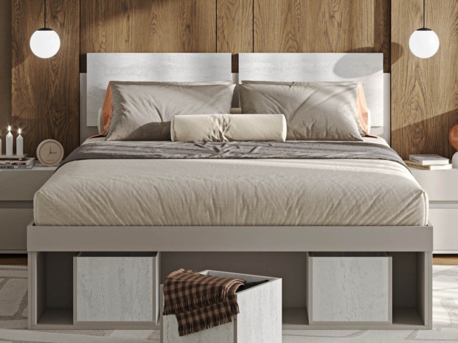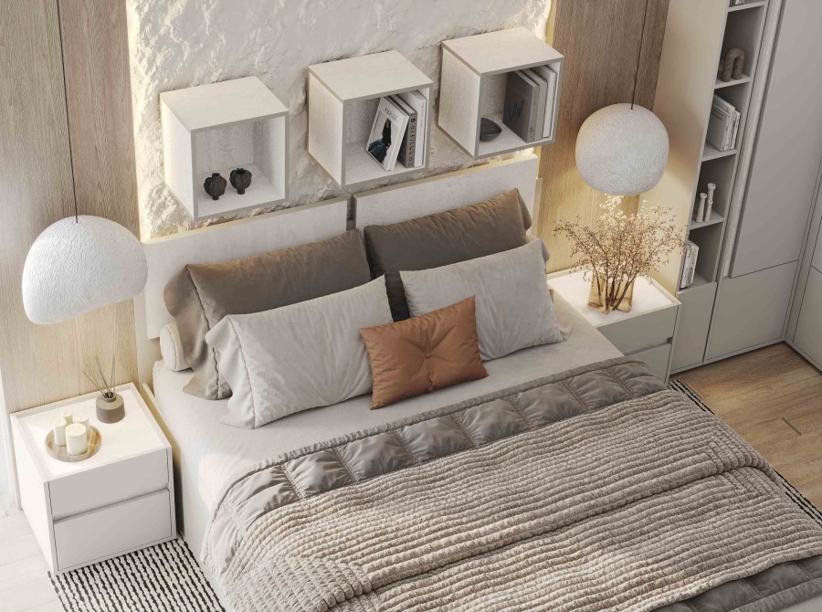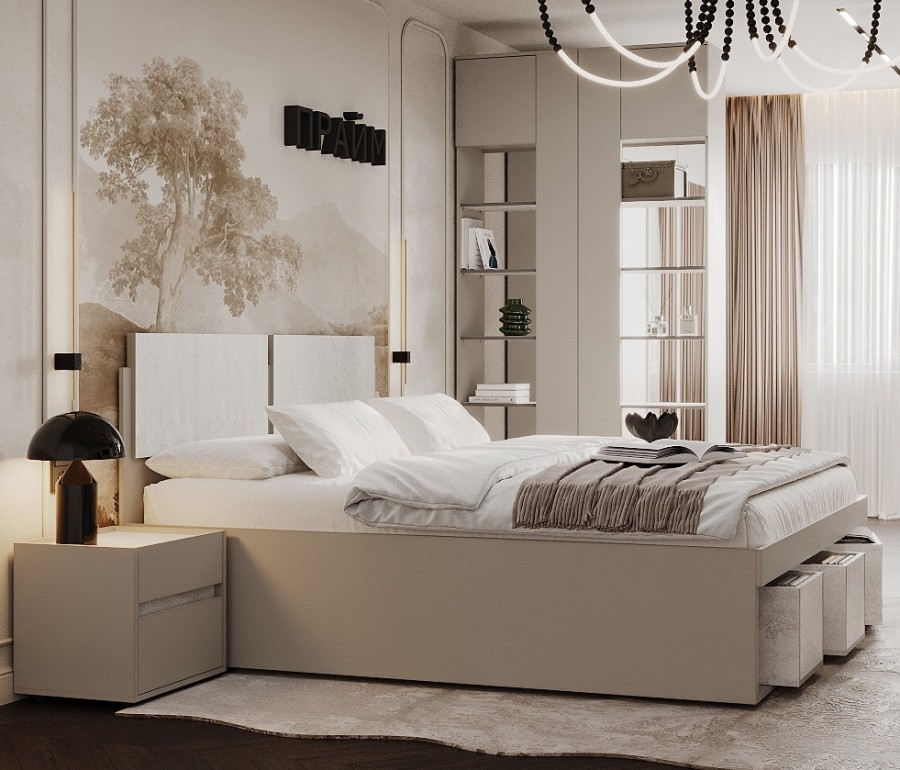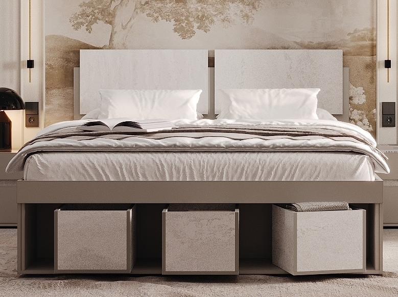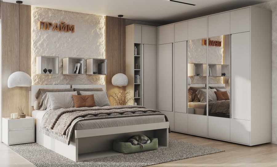 Изножье кровати можно дополнить модулями ПРАЙМ Куб 101. В них удобно хранить пледы, подушки или книги. Чтобы кубы мягко скользили и не царапали поверхность ниши, предусмотрены фетровые накладки. Кубы также оснащены подвесками для крепления к стене, что позволяет использовать их как полки или подвесные прикроватные тумбы.