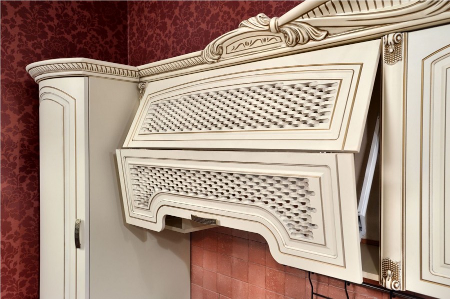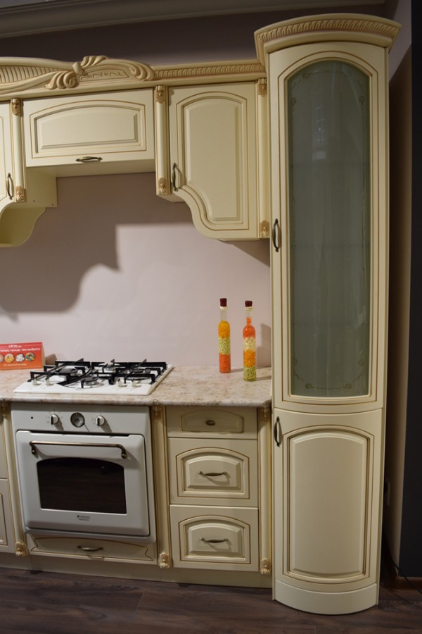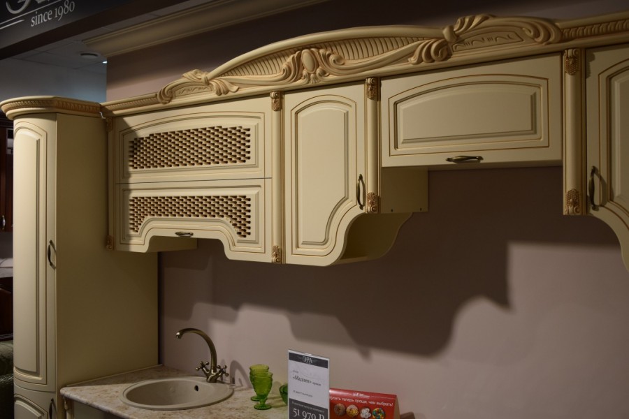 Кухня Мадлен элегантный гарнитур с двумя пеналами с радиусными фасадами. Пенал-витрина с матовым стеклом, на который нанесен рисунок методом пескоструя. Внутри витрины полки из стекла. Кухня украшена фигурным декором и золотой патиной. Навесной шкаф-сушка с фасадом-решеткой.