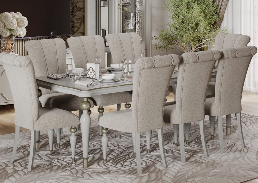 Компания из 8 человек будет чувствовать себя комфортно за обеденным столом Мария.Эффектный серо-платиновый цвет гарнитура, мягкая обивка отлично сочетается с любым интерьером. А декор в цвете холодное золото, придаёт особую изюминку этому гарнитуру.