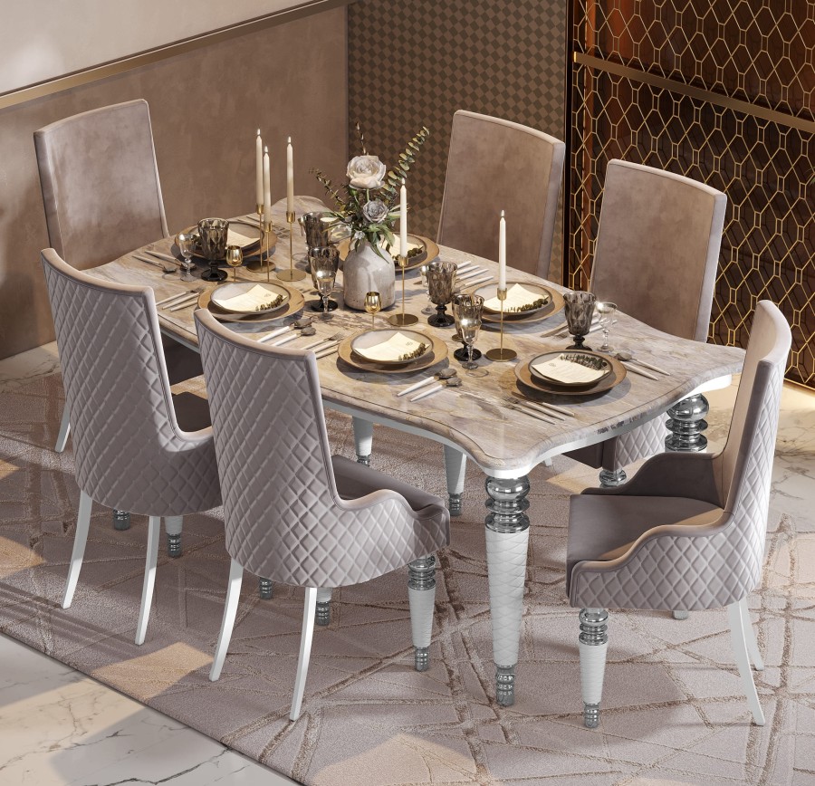 Компания из 6 человек будет чувствовать себя комфортно за обеденным столом Прадо.Прадо - это актуальный стиль Art-Deco, который получил второе дыхание за счет новых технологий и материалов. Ножки коллекции декорированы золотыми и серебрянными элементами, придающими коллекции шарм и изысканность. Столешница имитирует натуральный камень, чито придает особый шарм интерьеру.