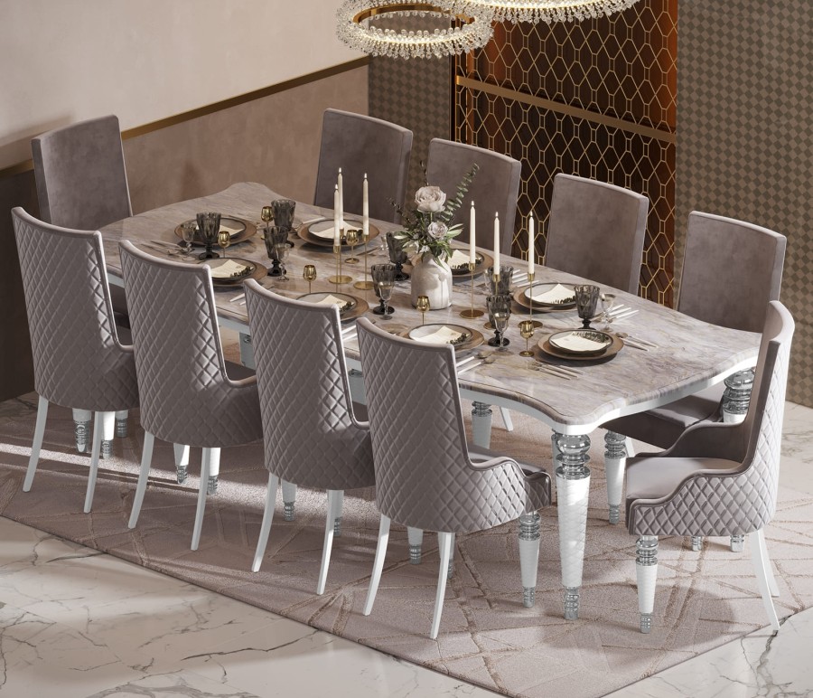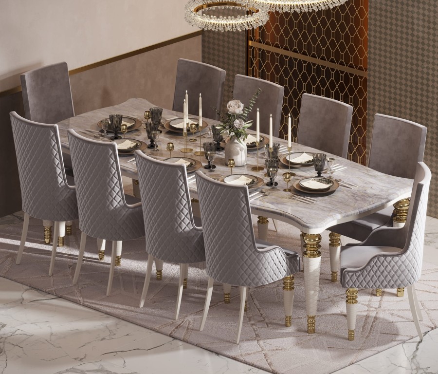 Компания из 10 человек будет чувствовать себя комфортно за обеденным столом Прадо.Прадо - это актуальный стиль Art-Deco, который получил второе дыхание за счет новых технологий и материалов. Ножки коллекции декорированы золотыми и серебрянными элементами, придающими коллекции шарм и изысканность. Столешница имитирует натуральный камень, чито придает особый шарм интерьеру.