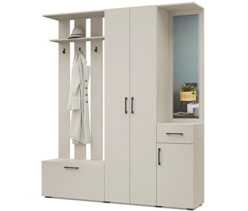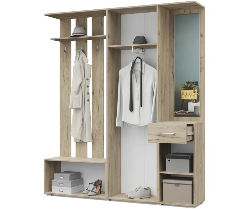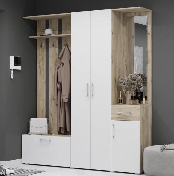 Функциональная прихожая Мальта представляет собой комплект мебели из ЛДСП, включающий шкаф, тумбу, полки, зеркало, вешалки, обувницу. Доступна в различных цветах Серый дуб/Белый, Кашемир.