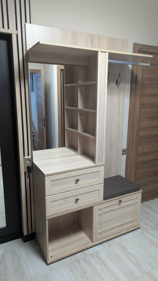 Узкая маленькая прихожая - вовсе не проблема. В простенок шириной всего 86 см может поместиться 7 плечиков с верхней одеждой, несколько курток на крючках, сумки, портфели, 18 пар обуви и средства по уходу за ней. Фантастика? Нет! Вам нужно всего два модуля: вешалка-стойка и узкий шкаф для обуви с выкатным стеллажом.