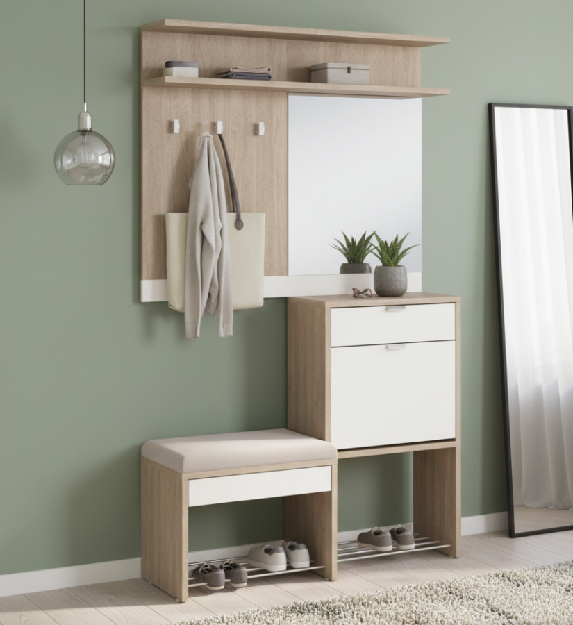 Коллекция для прихожей «Эльтон», представленная сочетанием декора палермо (с имитацией натурального дерева) и однотонного перламутра, будет прекрасно смотреться в современном интерьере. Грамотное соотношение открытых и закрытых зон хранения поможет поддержать порядок в Вашей входной зоне.