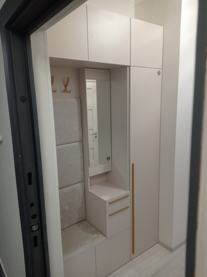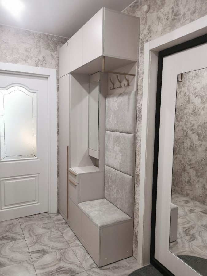 Представляем прихожую в суперсовременном цвете ЛДСП Кашемир. Модуль включает в себя элегантное зеркало с фацетом, удобный ящик для мелочей, отделения для обуви и мягкие элементы, чтобы создать идеальное пространство для вашей прихожей.