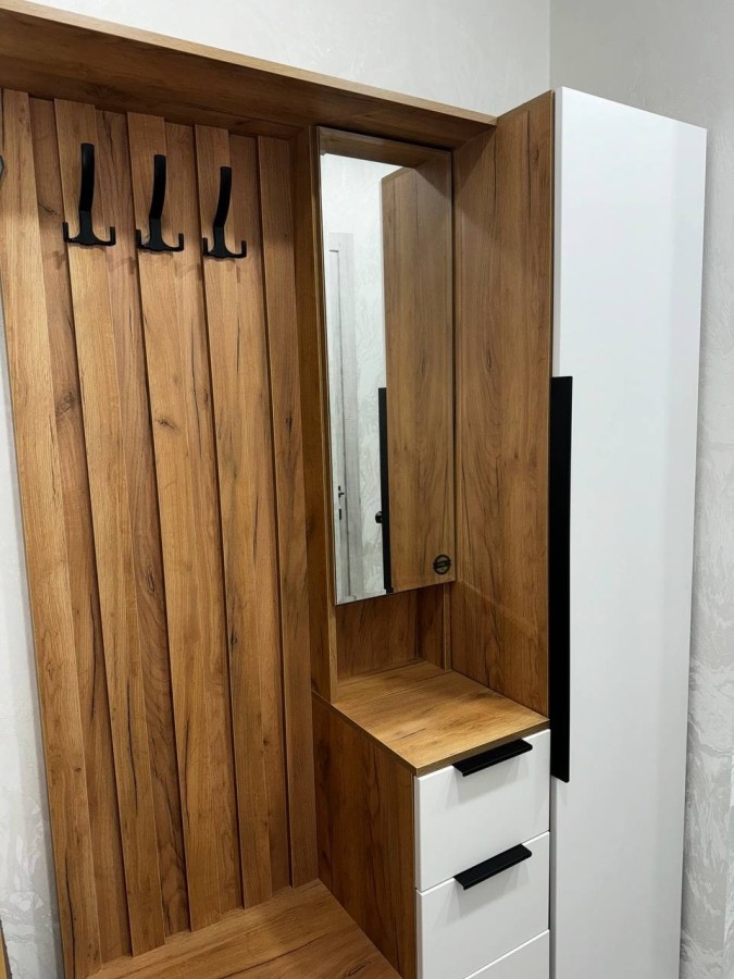 В прихожей ней есть всё, чтобы организовать идеальный порядок при входе в квартиру. Открытая вешалка с крючками обеспечит место для верхней одежды, тумба вместит несколько пар уличной обуви, зеркало зрительно расширит пространство и позволит привести себя в порядок перед выходом. За зеркалом - полки для косметики, аксессуаров. В выдвижных ящиках удобно сложить мелочи, аксессуары, предметы ухода. В шкафу и пенале за дверцами скрыты выдвижные ящики, полки, выдвижная штанга.