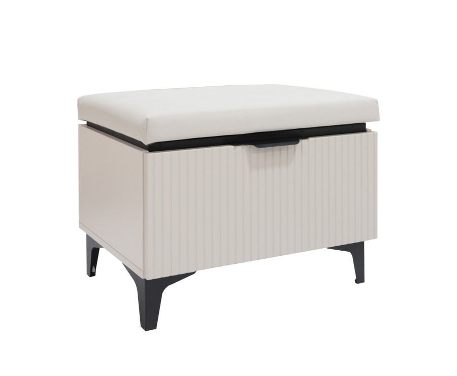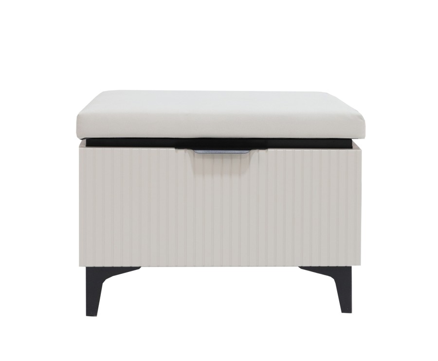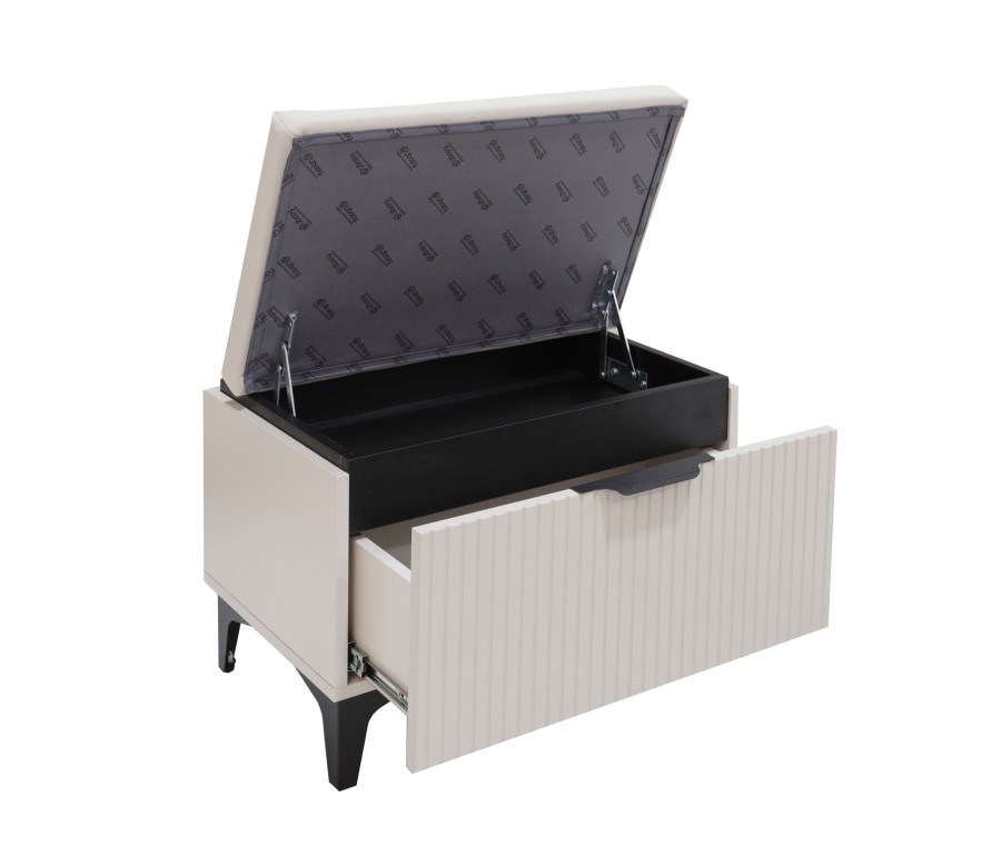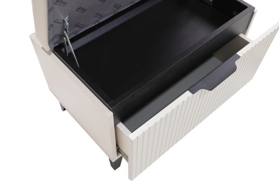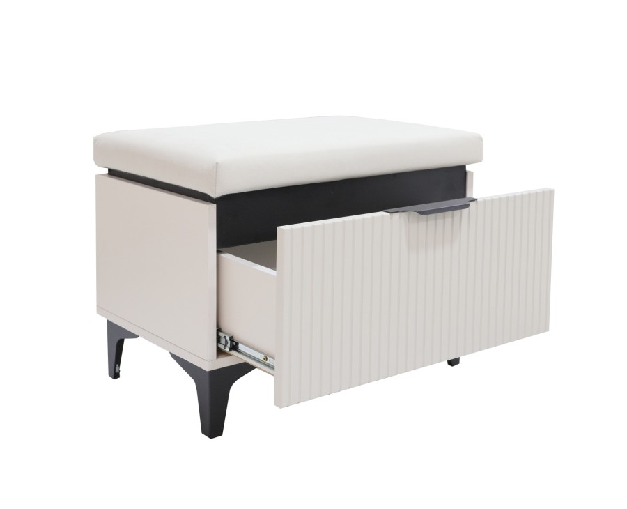 Тумба-пуф оснащена просторной полкой под сиденьем для хранения аксессуаров и необходимых вещей, а также выдвижным ящиком. Идеально подходит для гостиной, прихожей или спальни, добавляя уют и функциональность вашему пространству.