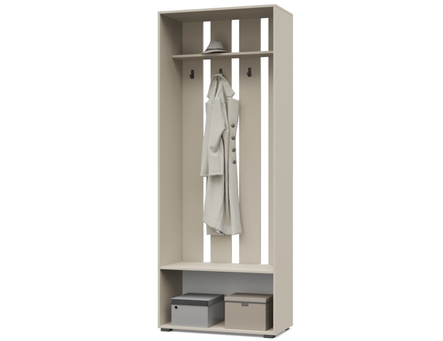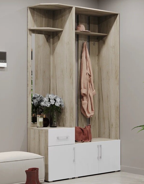 - Вешалка оснащена антресолью, крючками, тумбой.