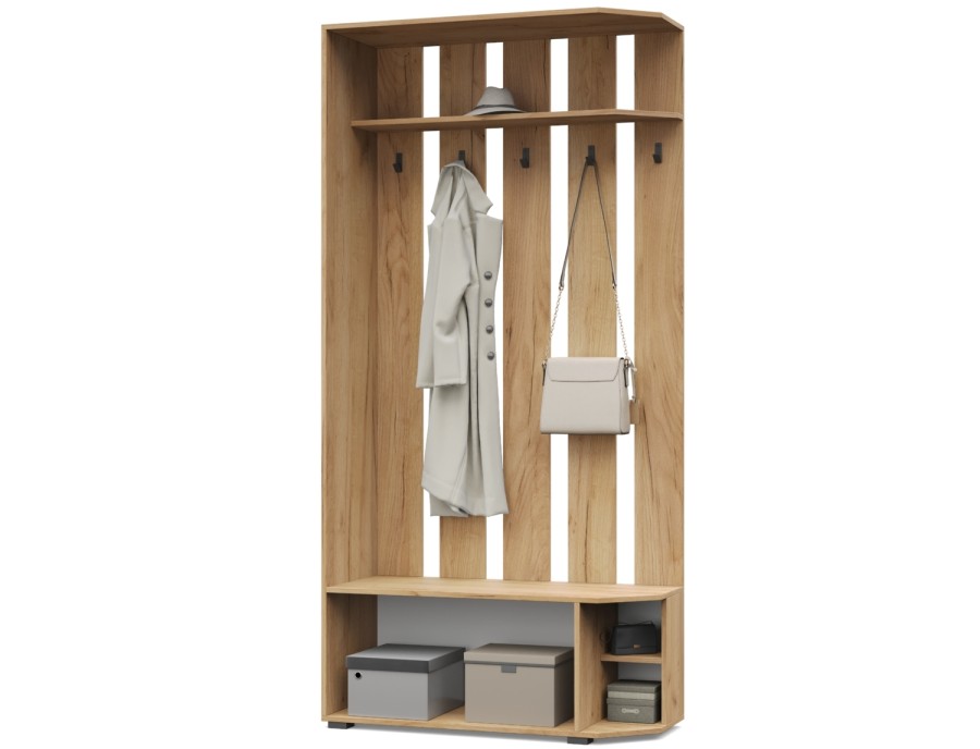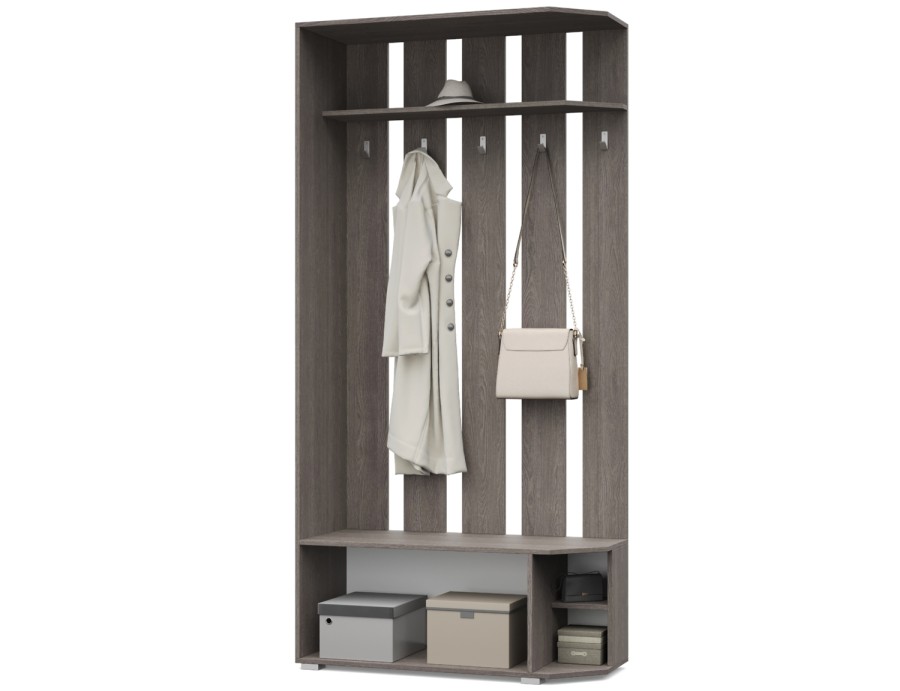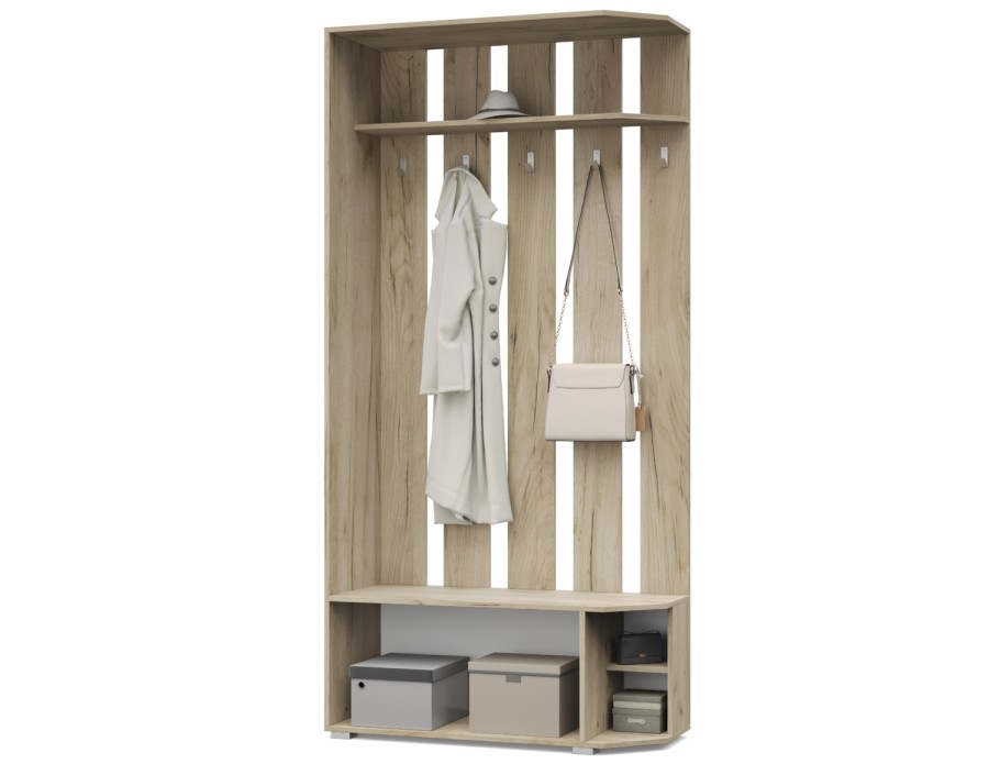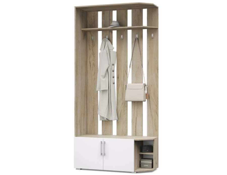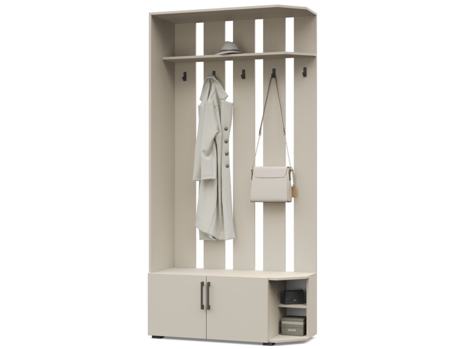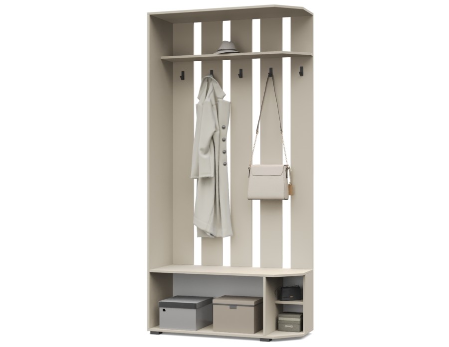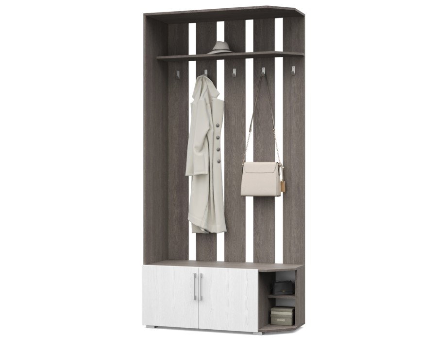 - Вешалка оснащена антресолью, крючками, тумбой.
