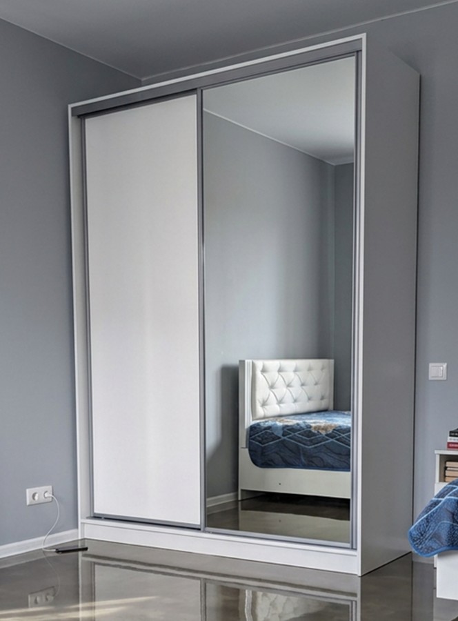 Продуманное внутреннее наполнение шкафа состоит из стеллажа для белья, четырех больших ниш внизу и вверху, а также стационарной штанги длиной больше метра. Две двери на стальном профиле "Найди" в цвет основного декора шкафа плавно перемещаются. Зеркальная дверца с обратной стороны проклеена специальной защитной пленкой, которая предотвратит от падения осколков, если она разобьется.