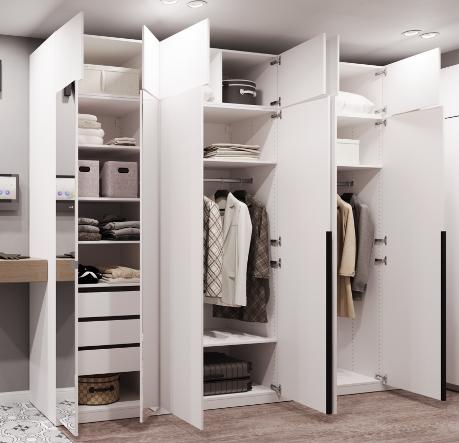 - Из модулей гардеробной РУМ можно составить как прямую, так и угловую компоновку. Обращаем Ваше внимание, что в угловом решении навешивание фасадов на «угол» не предусмотрено!